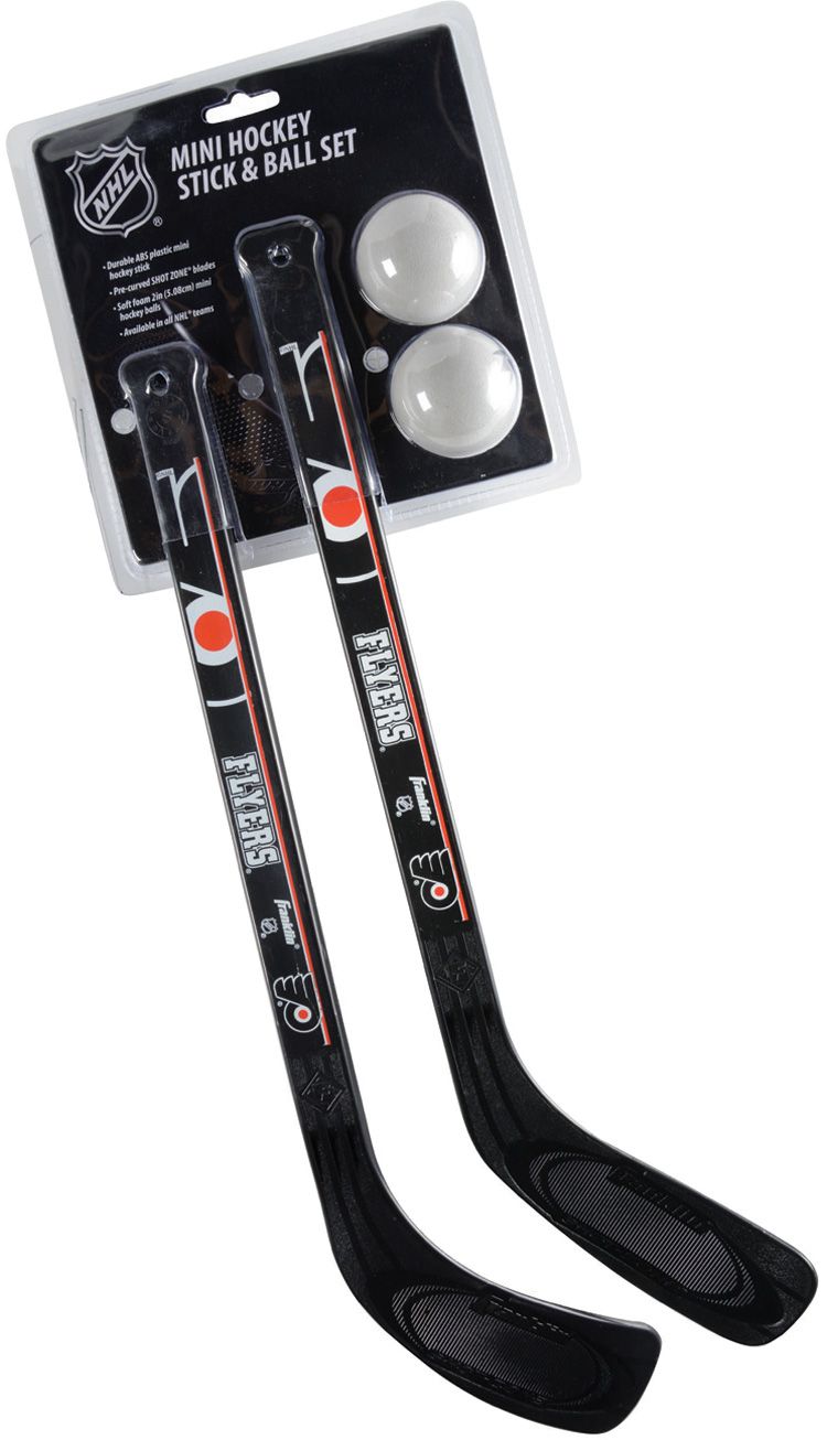 Earn your way onto the top power play unit with the Franklin® Philadelphia Flyers Mini Stick Set. You are a natural born scorer thanks to the SHOT ZONE® textured blade. High-impact plastic offers durable construction while the 20” stick keeps you in scoring range at all times. Salute your favorite team with the Flyers wordmark and logo scanning your shaft. You are a mini hockey master with the Franklin® stick set.