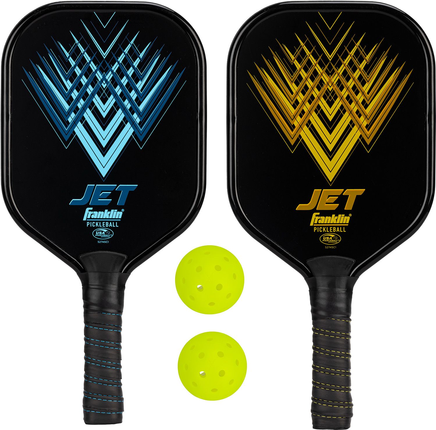 If you're new to the game of pickleball or looking to add friends and family to your matches, the Franklin Sports 2 Player Pickleball Paddles + Balls Starter Set is the perfect bundle for you! This starter pickleball set comes with (2) aluminum Jet pickleball paddles and (2) X-40 outdoor pickleballs included, so you have all the accessories you need for two players to hit the court and play. The aluminum Jet pickleball paddles are built for quality performance and superior durability for long lasting play.