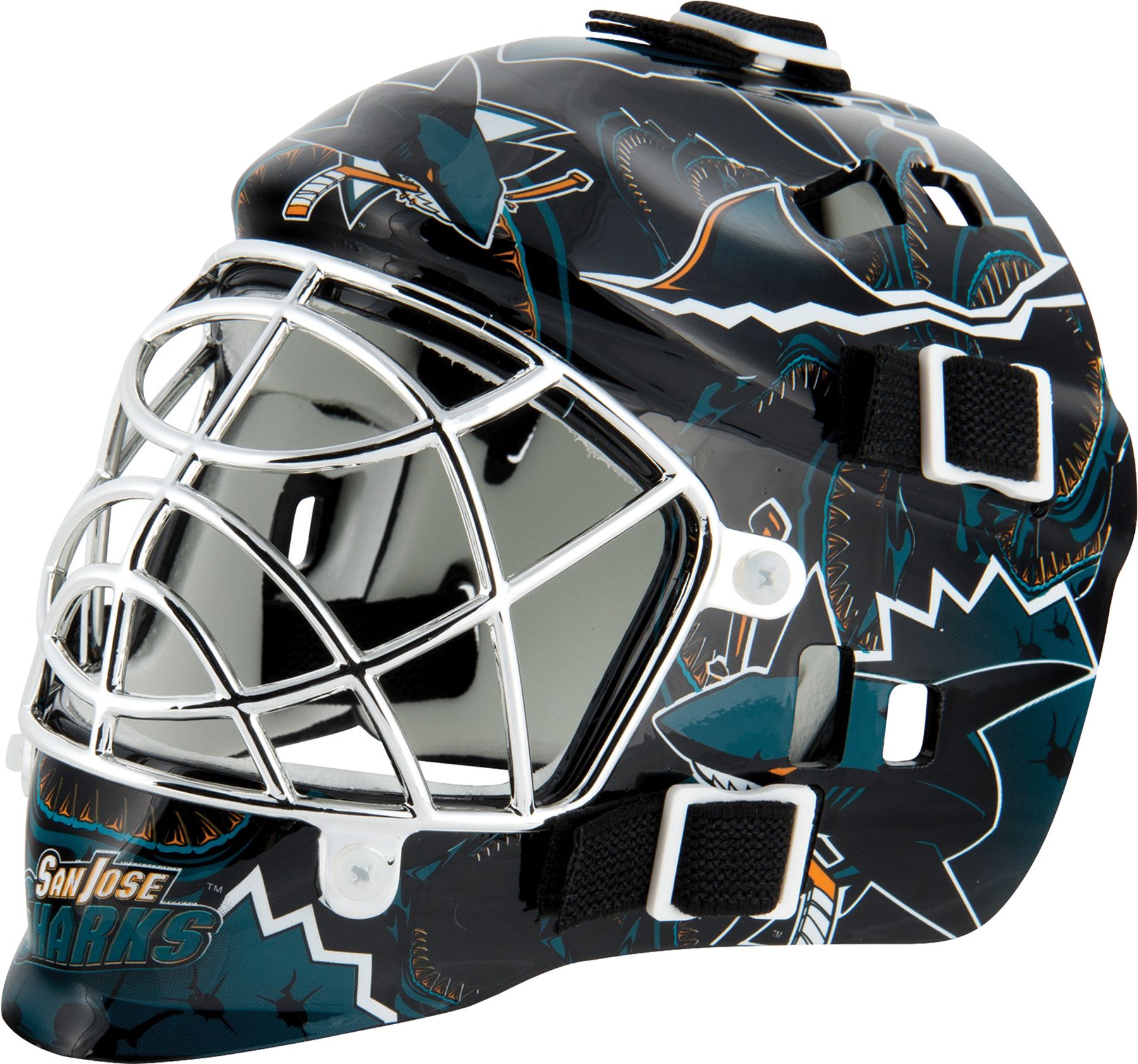 Show your skill between the pipes with the Franklin® San Jose Sharks Mini Goalie Mask. Team colors and logos decorate this mini goalie mask, helping it look just like the one your favorite netminder wears on game day. The plastic vented shell, adjustable back plate and chrome-finished plastic cage create a look as authentic as the Sharks. Score a shutout for your favorite Western Conference team with the Franklin® mini goalie mask.