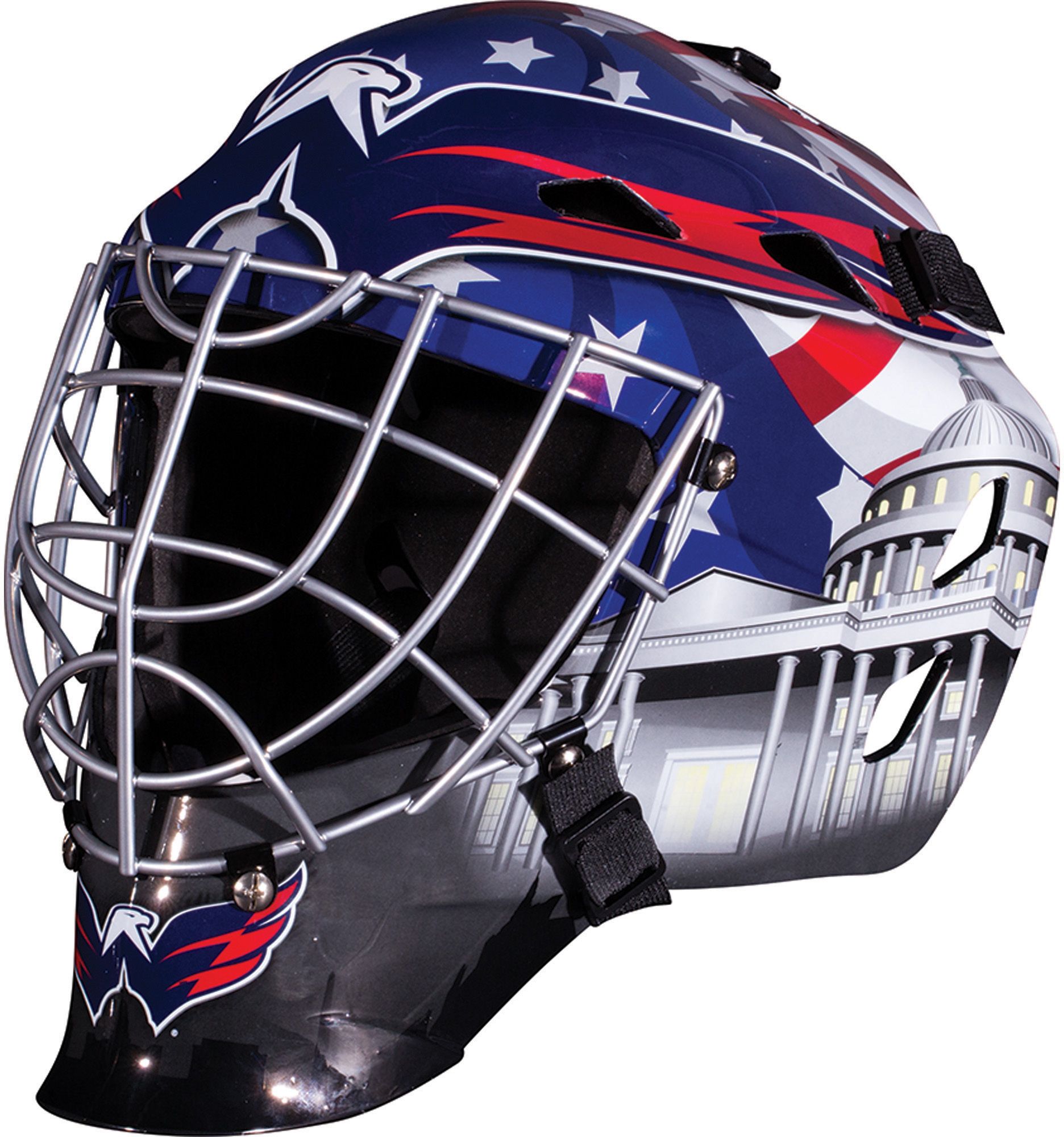 Show your skill between the pipes with the Franklin® Washington Capitals Mini Goalie Mask. Team colors and logos decorate this mini goalie mask, helping it look just like the one your favorite netminder wears on game day. The plastic vented shell, adjustable back plate and chrome-finished plastic cage create a look as authentic as the Capitals. Score a shutout for your favorite Eastern Conference team with the Franklin® mini goalie mask.