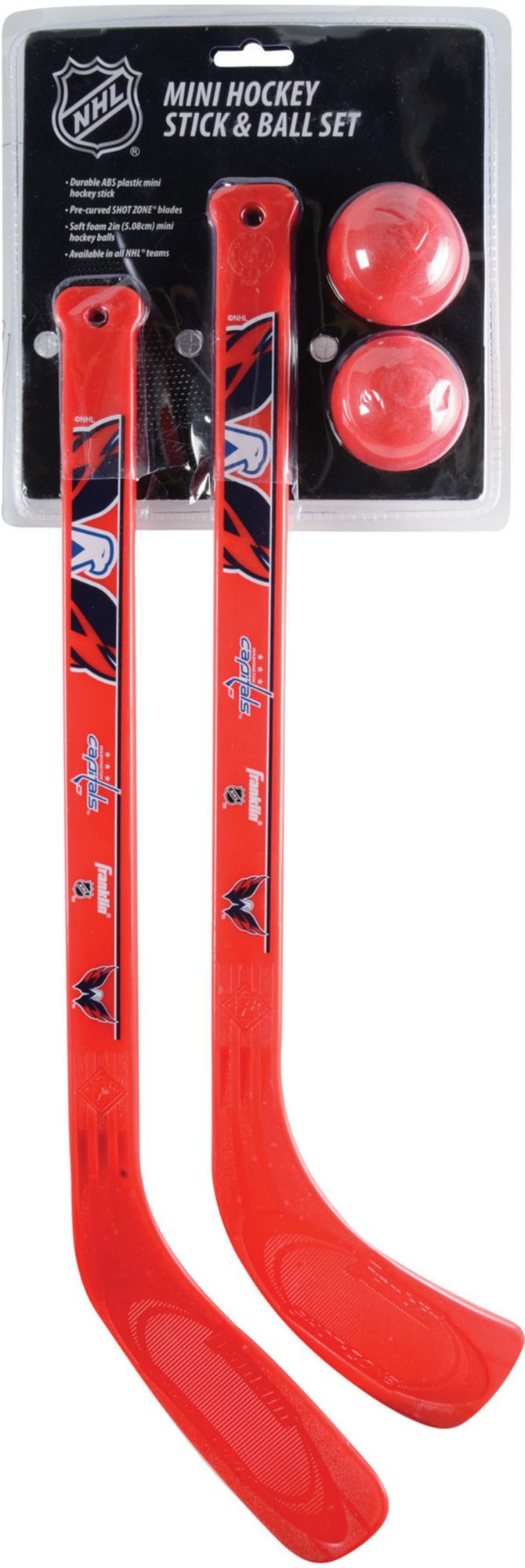 Earn your way onto the top power play unit with the Franklin® Washington Capitals Mini Stick Set. You are a natural born scorer thanks to the SHOT ZONE® textured blade. High-impact plastic offers durable construction while the 20” stick keeps you in scoring range at all times. Salute your favorite team with the Capitals wordmark and logo scanning your shaft. You are a mini hockey master with the Franklin® stick set.