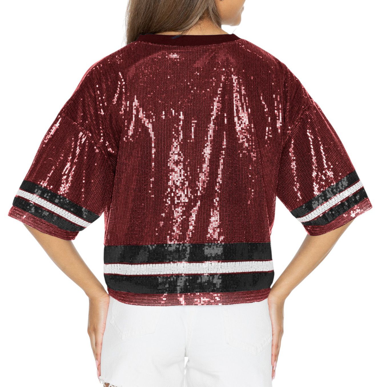 • Sparkly sequins all over with stripes in coordinating team colors around the bottom and sleeves