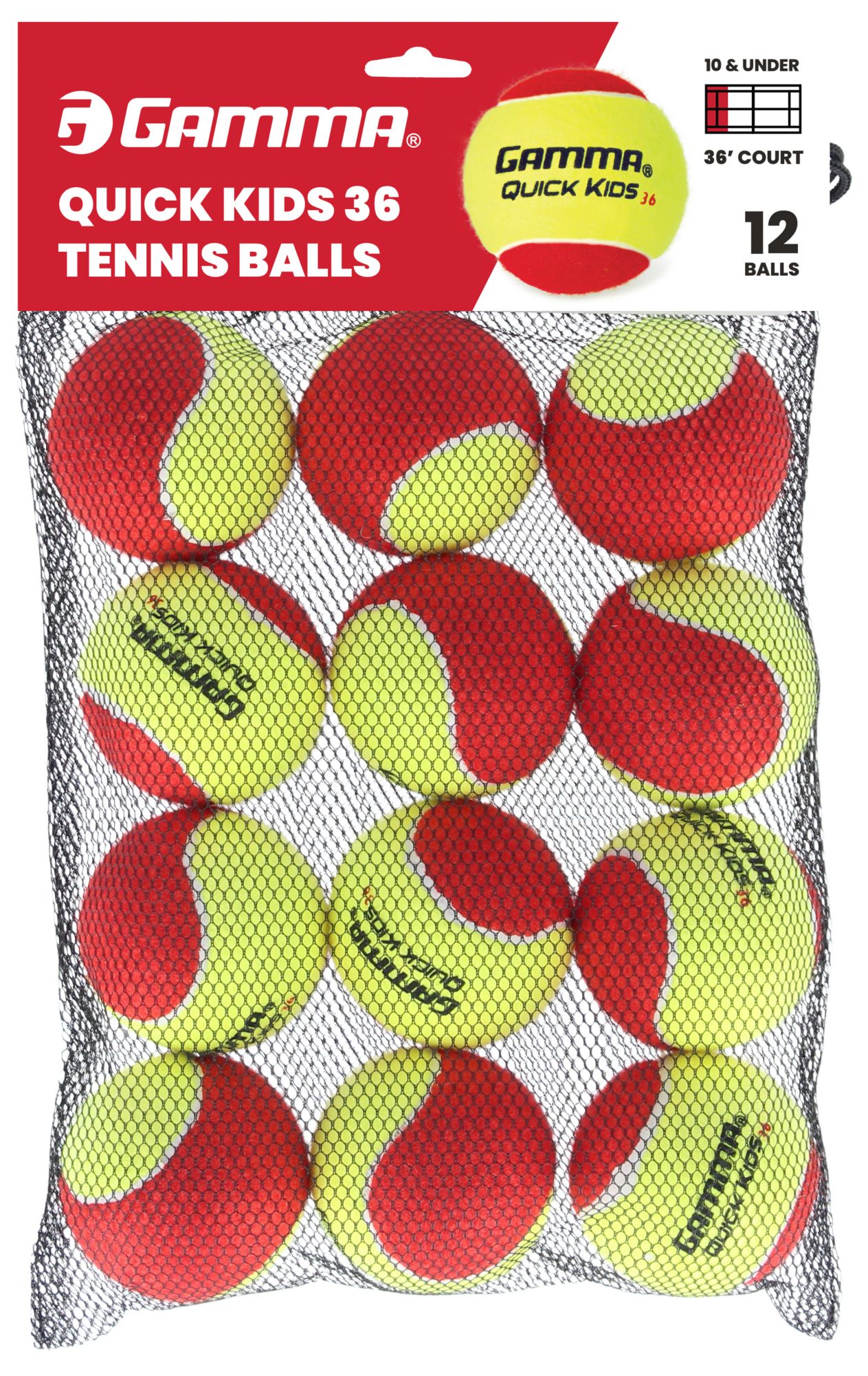 For young players starting the game and learning the art of spin, the GAMMA Quick Kids 36 Tennis Ballls feature a two-tone felt for easy instruction. The Quick Kids 36 balls are USTA approved for 10 and under tennis and ideal for ages 8 and under on a 36' court. These lightweight balls feature a low compression core making them 75% slower than a standard tennis ball and providing a lower bounce. USTA/ITF Stage 3 Specification.