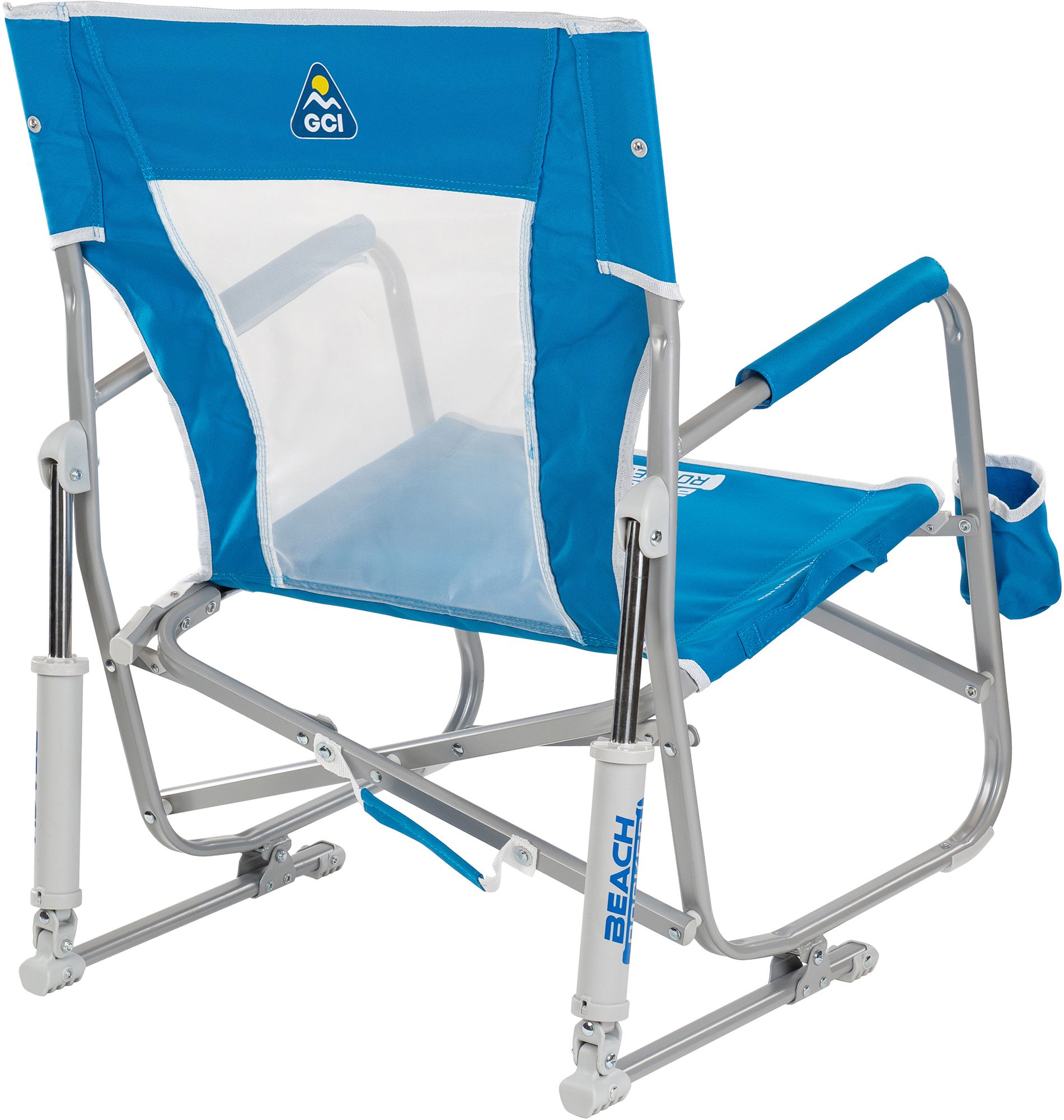 Enjoy the sun and surf in the comfort of the GCI Outdoor Beach Rocker - the original rocking chair crafted for waterside adventures. Featuring Spring-Action Rocking Technology™ for a smooth rocking motion and a lowered seat to stretch out with your toes in the sand, get ready for a relaxing day by the shore. Setting up is a breeze thanks to Eazy-Fold Technology™, which allows you to open and close the chair quickly and effortlessly. The padded armrests provide extra comfort and support, making it easier to sit down and stand up, while the mesh backrest lets the cooling ocean breeze flow through, keeping you refreshed on hot days. To top it off, a built-in beverage holder ensures your favorite drink is always within reach. When the sun sets and it's time to head home, the chair's convenient carry handle and fold-flat design make transportation and storage a snap, leaving plenty of room in the trunk for your cooler and other beach essentials.