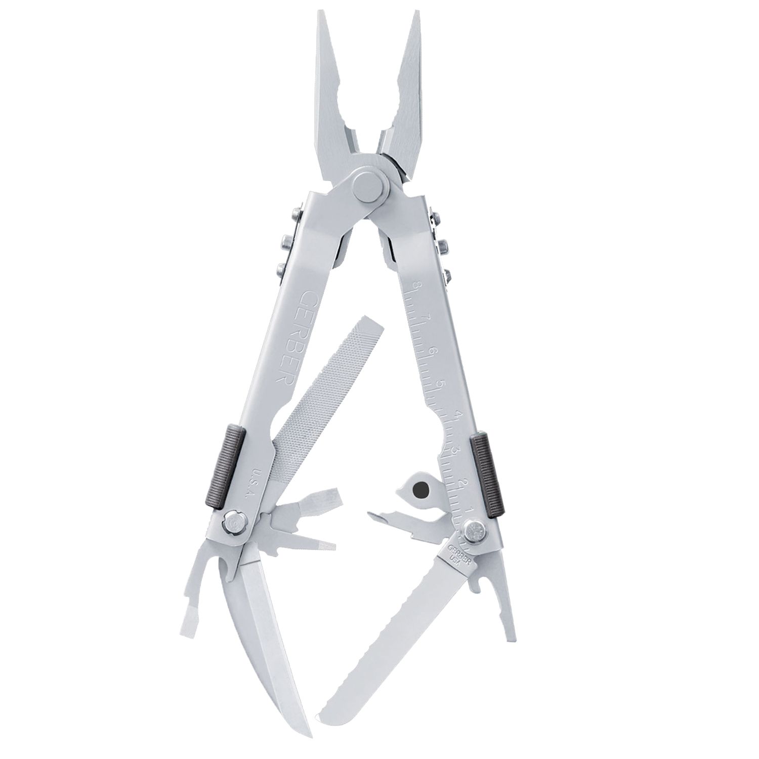 Durable and reliable, the Gerber® MP600 Needlenose Multi-Tool tackles any task. Conveniently access any of the 14 tools with the one-handed opening feature. High quality stainless steel construction ensures the MP600 will be with you job after job. Includes edged and serrated blades, flathead and Phillips screwdrivers, a ruler, a crimper, a bottle/can opener, wire cutters, and pliers.