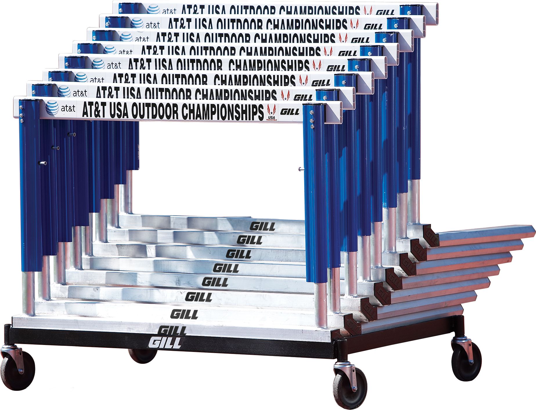 Take the hassle out of hurdle setup and storage with the Gill® Flight Hurdle Cart. Made of strong steel, this cart can carry 10 “L” shaped hurdles and features a powder-coat finish for added durability. Four swiveled wheels make moving around the track simple and efficient, saving you time and effort.