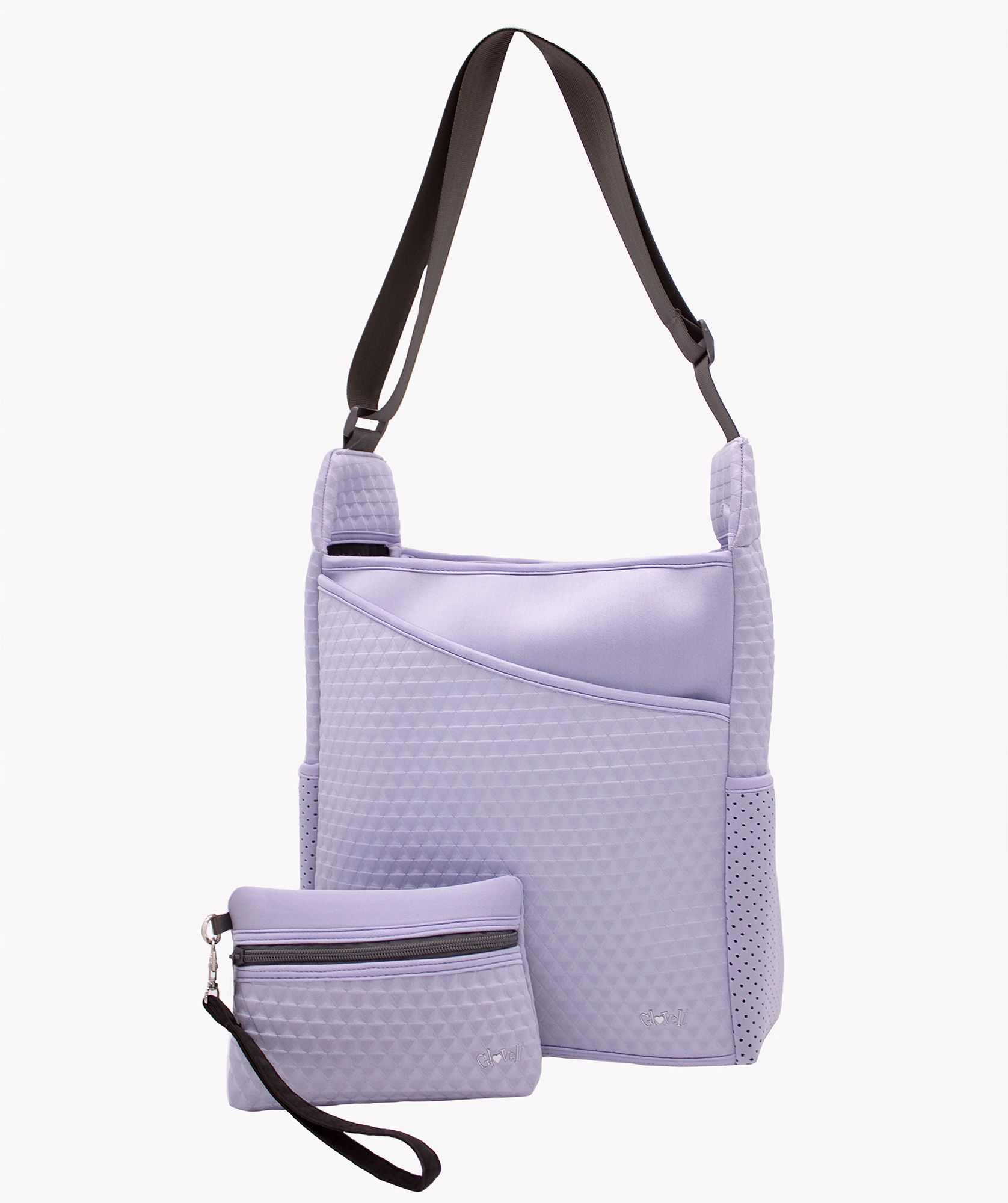 A stylish and minimalist bag,this a must-have for any outdoor activity. Glove It's sport tote bag and wristlet are made of premium quality neoprene for durabilty and on the go ease! Each tote comes with a color-matching zippered pouch that separates valuable items such as cash, cards, and your phone for easy acess and loss pervention. The front pocket is large enough for a tennis racket, pickleball paddle or even laptop. The adjustable strap can be worn as a shoulder bag or cross-body bag. The heavy-duty zipper ensures long-lasting wear. Both side pockets easily fit a water bottle or sport balls.