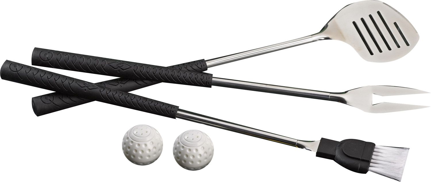 Show your love for your favorite outdoor sport even while you’re grilling with the Clubhouse Collection® 5-Piece Barbecue Golf Set. At the end of each handle is a golf motif accent that adds a little fun to your cooking. This set includes a brush, tongs, salt and pepper shakers and a spatula. You’ll never cook or grill again without this heavy-duty set.