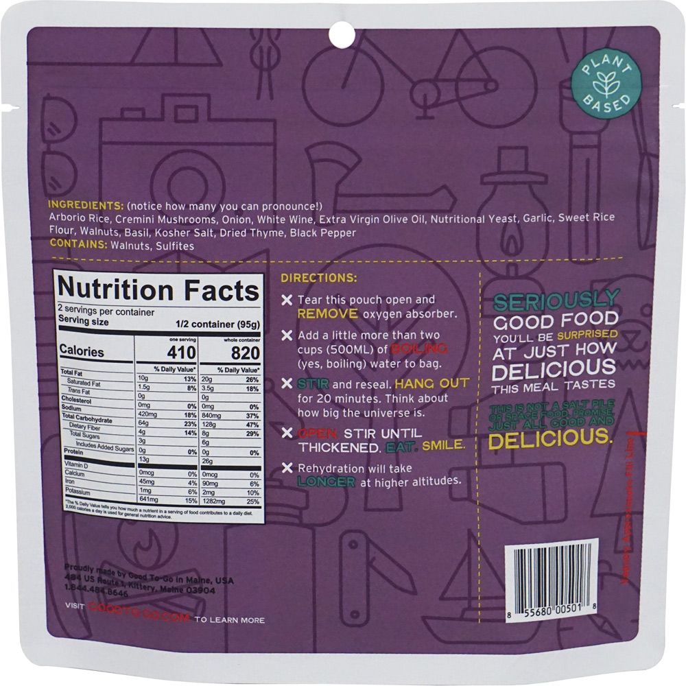 [This review was collected as part of a promotion.] I love all of Good To-Go's meals! (The Thai curry is my current favorite.) They are delicious, filling, and satisfying after a long day of hiking. They are all dehydrated, so a little on the heavy side compared to other backpacking options, but the quality of the food/flavor makes it worth the extra weight. The packaging is durable; we never experienced any breakthroughs, holes, or leaks. And the company's co-owner and chef, Jen, recently become HACCP certified, so be on the lookout for options with meat in them coming soon! The herbed mushroom risotto has a really great depth of earthy flavors. It is less texturally interesting than other GTG options, so if mushy foods bother you, I would maybe recommend one of their other products.