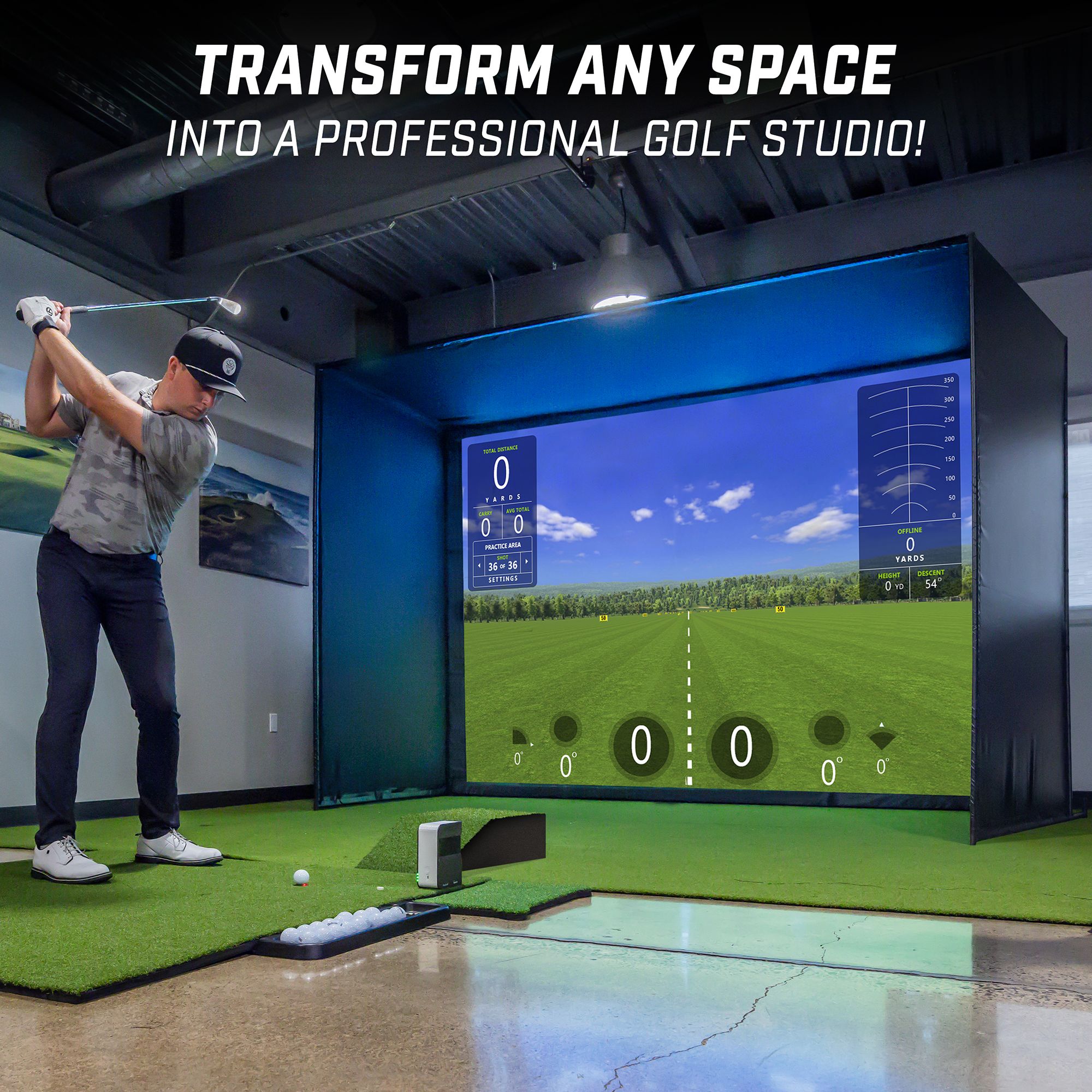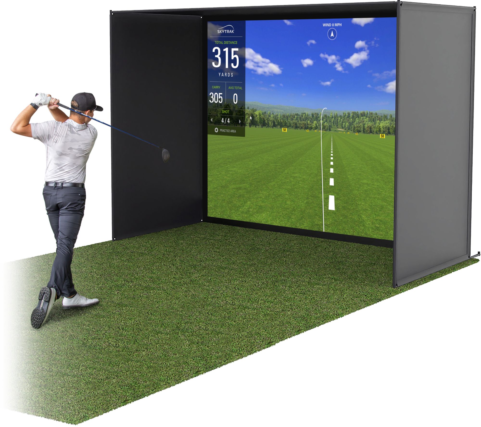 GoSports 10 x 8 ft Golf Simulator Enclosure brings the course to your home! The ideal 4:3 aspect ratio screen with side and top coverings makes it an indispensable training aid for serious golfers who want the best. The enclosure features commercial grade quality at a significantly lower cost, making it an affordable choice for setting up a home driving range. This indoor practice solution is compatible with all leading launch monitors and projectors, although devices are not included. The impact screen, made of high-density woven polyester, ensures a reliable and durable projection surface. Assembly is easy, with comprehensive instructions allowing you to set up in 30 minutes or less, assuming a room height of 9 feet and adequate space for swinging. Built for durability, the setup includes a sturdy steel frame and reinforced impact screen, with foam padding to minimize rebounds and prevent balls from slipping underneath.