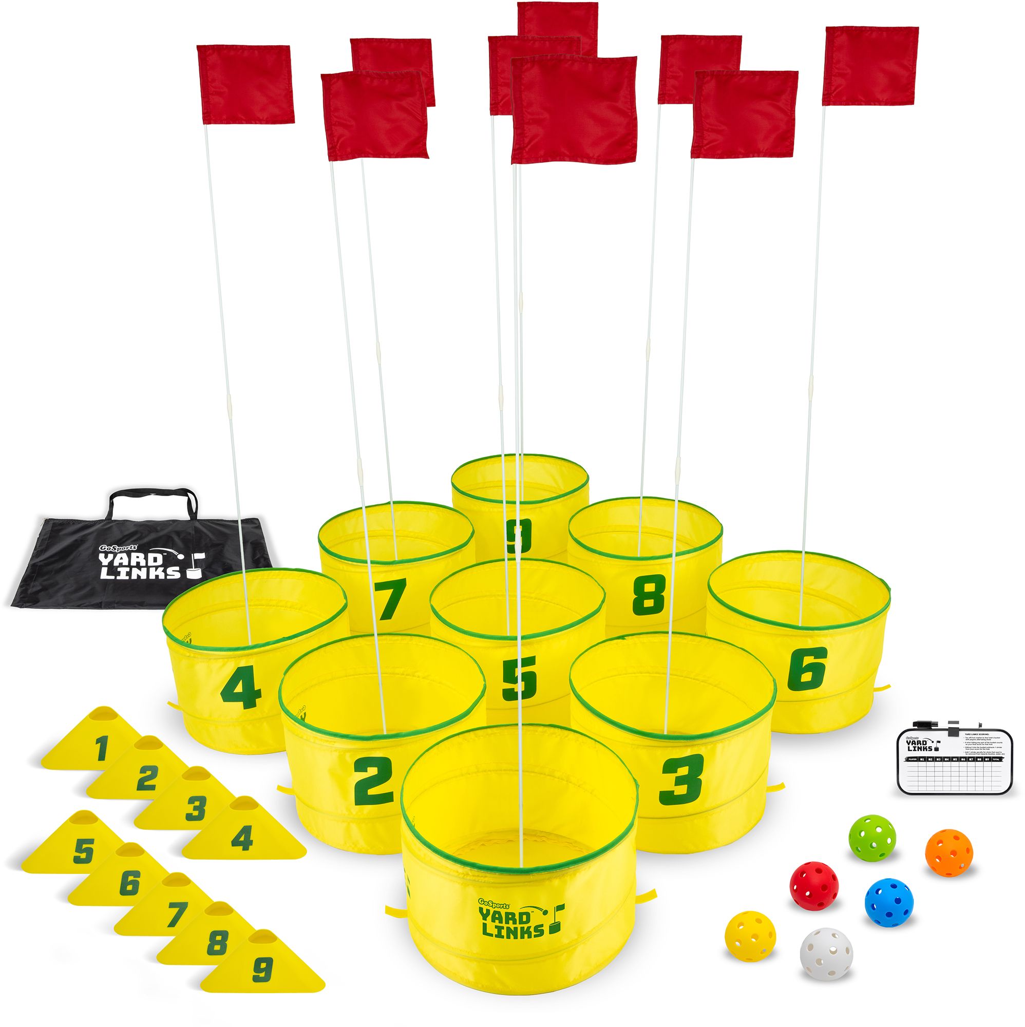 Includes 9 buckets, 9 flags, 9 tee markers, 6 Yard Links balls, dry-erase scorecard and carry case for travel & storage (golf clubs not included - wedges recommended)