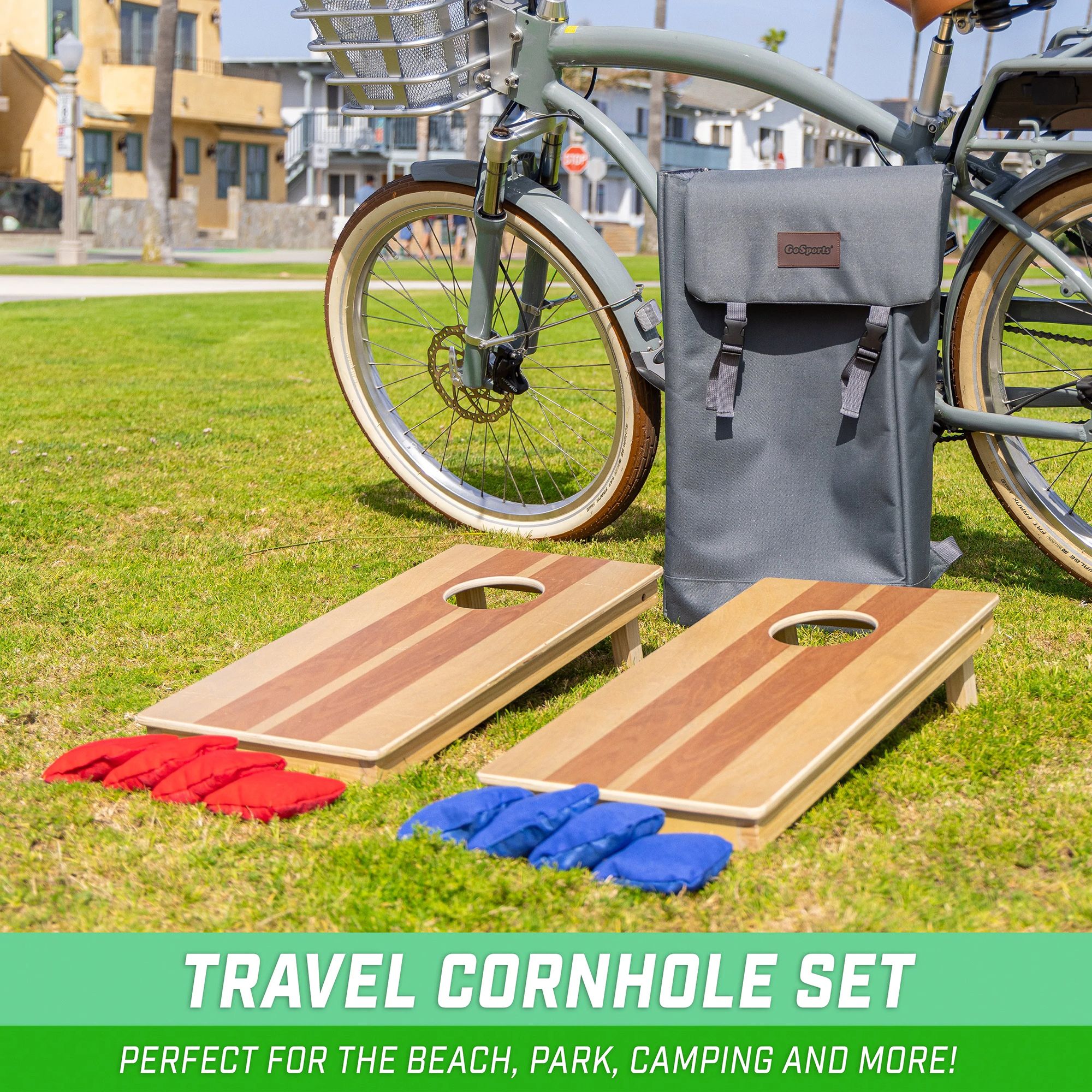 Love the size. The whole family had had much fun playing The! The board is solid wood with some classic stained stripes. The backpack is AWESOME; it is actually my favorite part. I love the padded straps and the perfectly sized design for carrying on the go. This set is perfect for traveling! It’s about half the size of the standard set, a fraction of the weight, and super portable and convenient to take to the park, or a friends house. It’s as strong and sturdy as it gets, and comes with professional, 2-sided stick and slick bags. It uses different fabric on each side to make one side slicker than the other.I can’t wait to take this backpack version camping with me. It would be great at tailgate parties, company picnics in the park, at the beach and just about anywhere you are participating in an outdoor get together. This set is so convenient to carry and use that I can see it being used quite frequently. Plus, it is a lot of fun! If you are thinking about ordering it, Just Do It! You and others will have hours and hours of fun.
