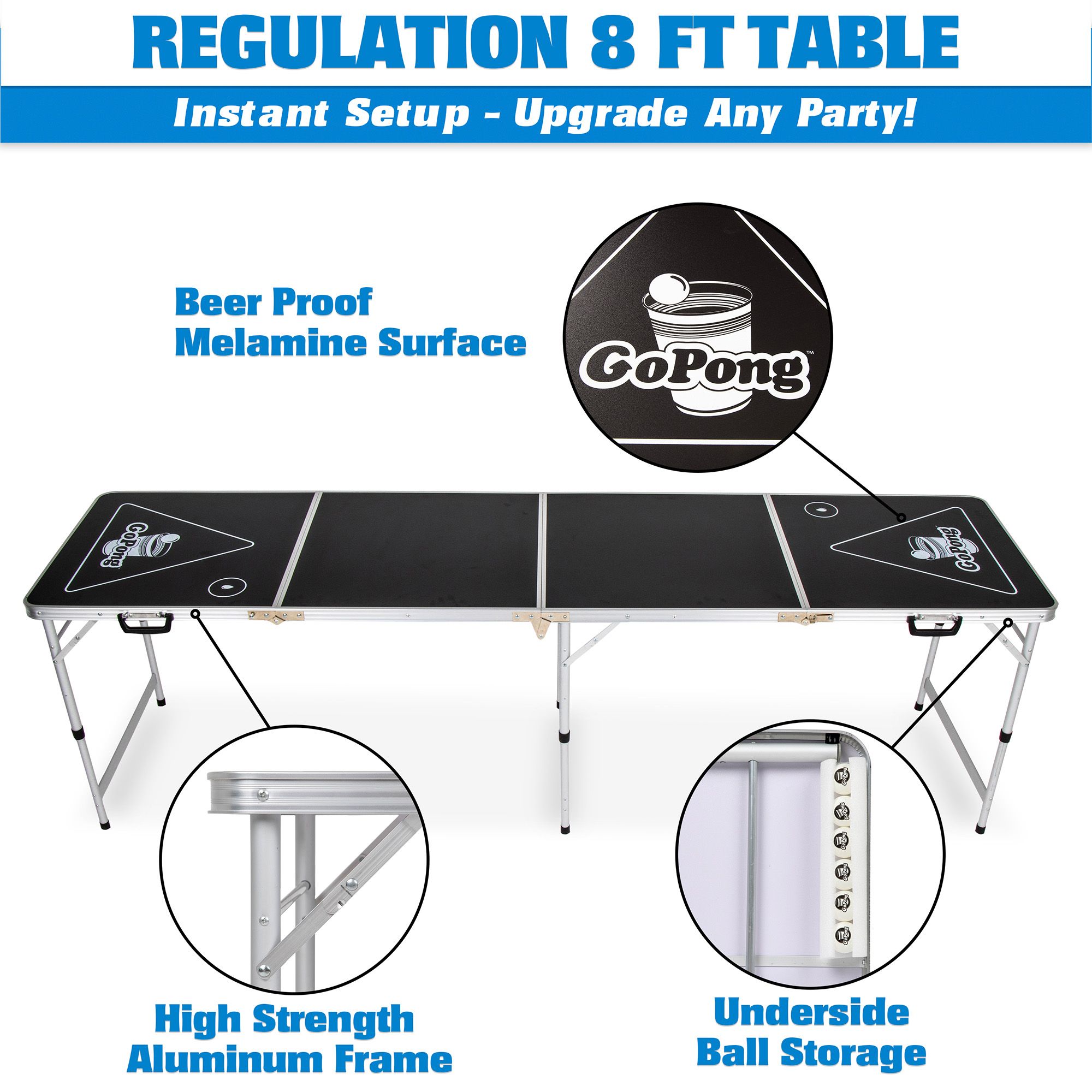 - UPGRADE YOUR PARTY: Portable 8-foot pong table made of high-strength yet lightweight aluminum; 6 pong balls included