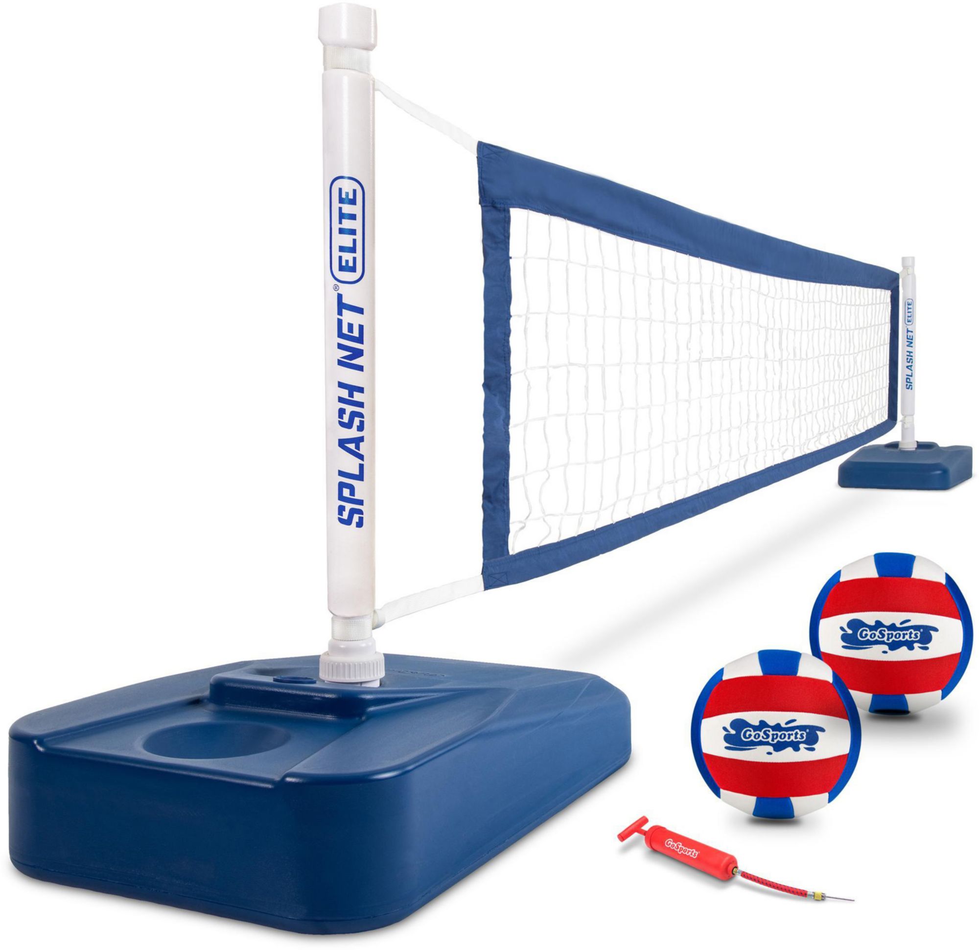 Experience endless summer fun with this ultimate pool volleyball set. The game includes a net with premium trim and adjustable width (32ft max), 2 pro style neoprene volleyballs, and ball pump. Our modern design is both fun and functional, featuring durable state of the art construction built to withstand years of competitive pool volleyball action! The heavy-duty water filled bases provide maximum stability, while also allowing you to store away your Splash Net during the off-season. Ready to play? Set up your poolside volleyball court in 10 minutes or less! Now set, serve, and spike on summer pool parties with the GoSports Splash Net ELITE Pool Volleyball Game!.