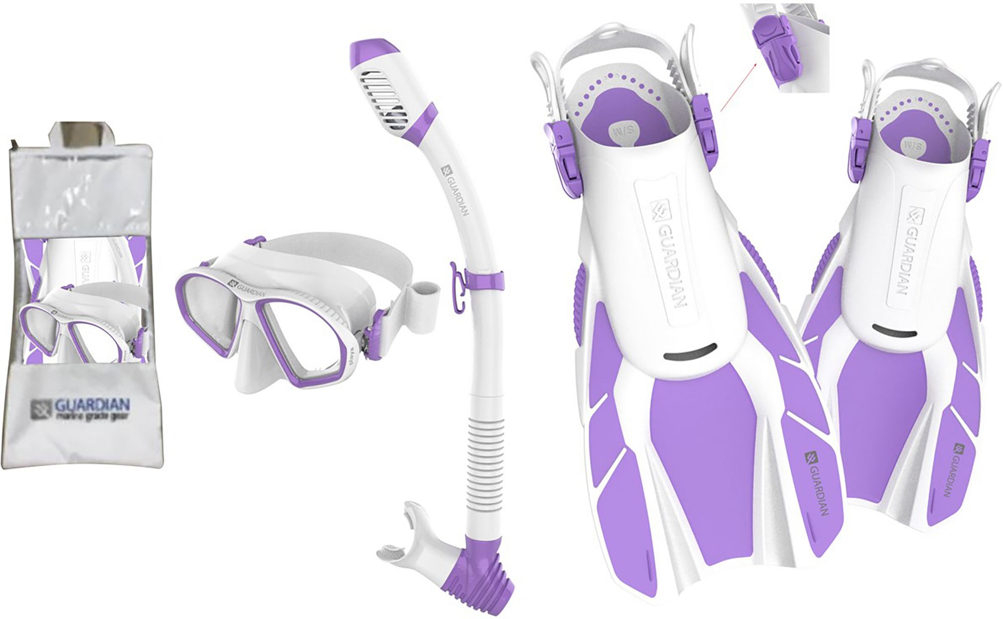 Pro scuba quality mask and dry top snorkel meet beautiful contemporary styling for a classy, tropical feminine look. PLAYA mask has an ultra soft mid-sized skirt to fit smaller faces as well as an elastic strap with quick disconnect and sewn-in snorkel loop. Dry top snorkel has pro scuba quality silicone mouthpiece and drop away flex tube and keeps water from entering the tube on the surface or if submerged. Easy to pack and easy to kick snorkeling fins complete a pro quality, fashion forward set. Fins come in two adult sizes - unisex shoe sizes 4-8.5 and 9-13.