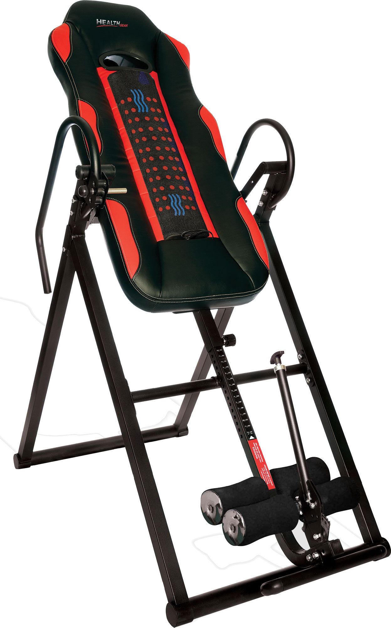 This Health Gear® Deluxe Inversion Table incorporates the latest in heat and massage inversion therapy. The extra long, wide back rest support is fully padded for additional comfort and support for a wide range of users. The frame is designed to fold for easy storage and comes with 4 comfortable foam leg rollers.