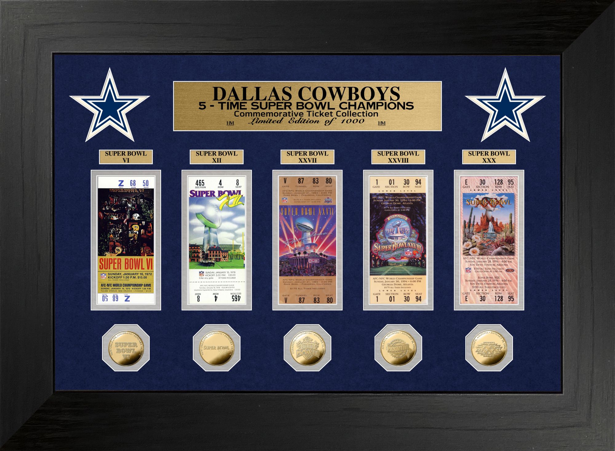 Celebrate the Cowboys’ Super Bowl® championship seasons with The Highland Mint® Dallas Cowboys Super Bowl® Ticket and Coin Collection. Framed in a 22” x 18” black wooden frame, this keepsake features the Super Bowl® tickets and the 24kt gold flashed game coin. Die-cut team logos and an engraved nameplate at the top put your loyalty for the team on display. A glass frame and double matting keeps this collectible looking sharp.