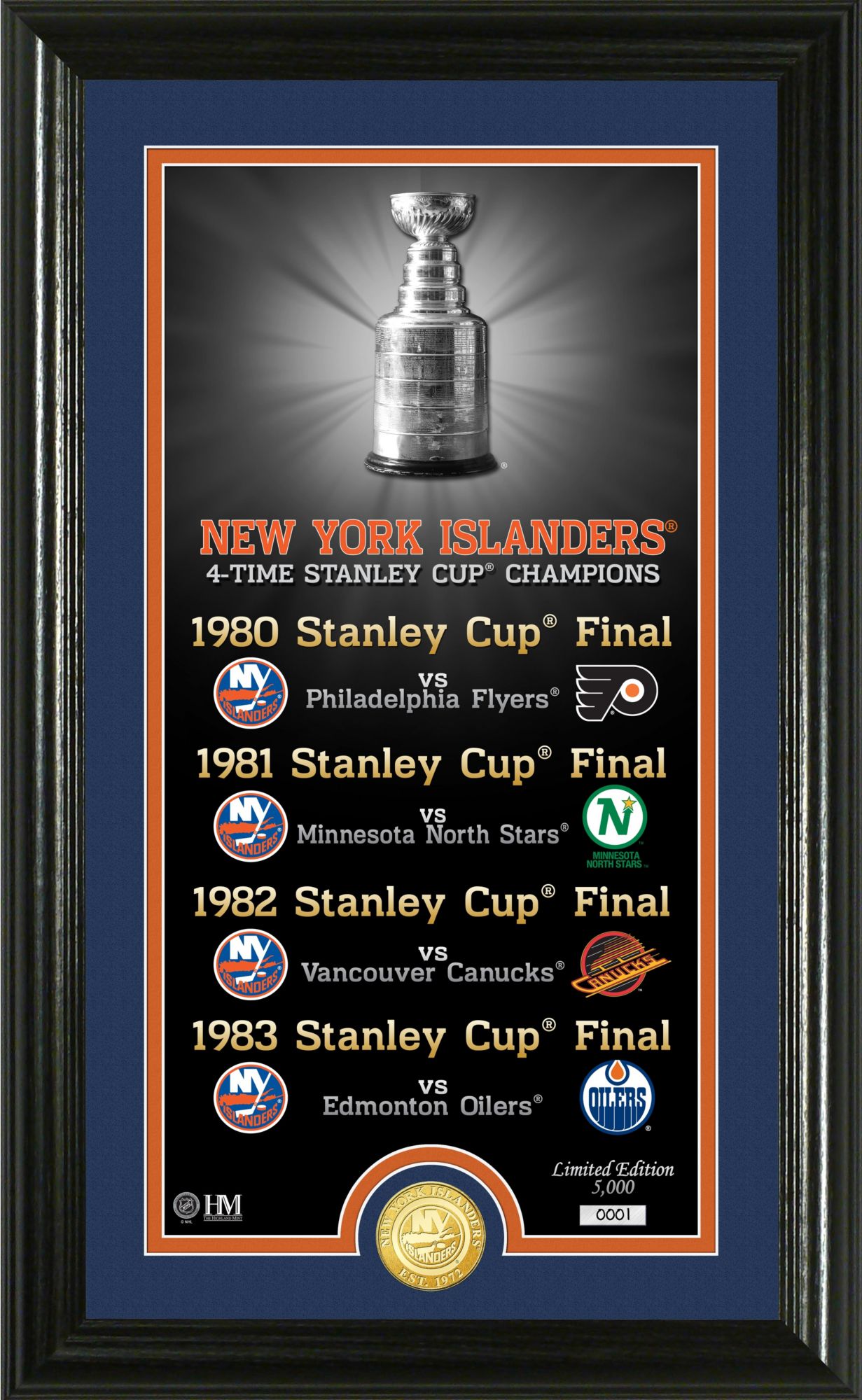 • 7” x 15” custom individually numbered double matted photo listing each team Stanley Cups® with a minted 39mm solid bronze team commemorative coin