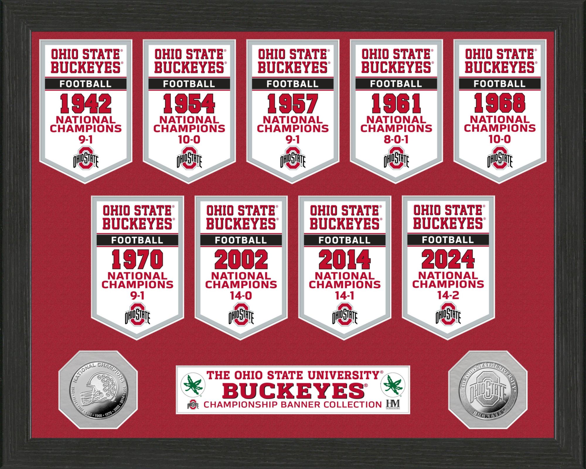 • Matted below the banners is a 39mm minted 9-time champs silver-plated coin, and a minted Ohio State University silver-plated coin