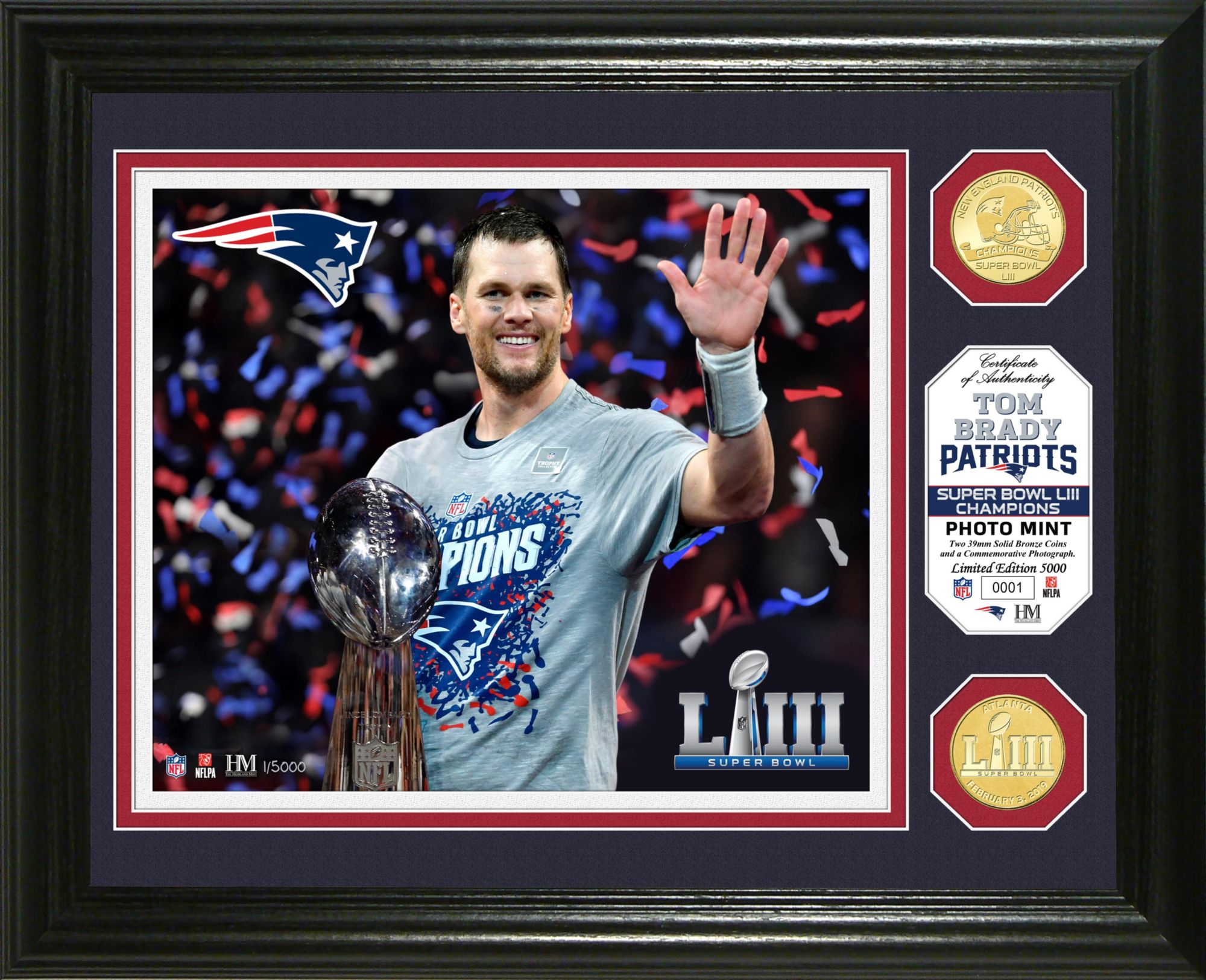 Update your den with a piece of Super Bowl LIII® history with the Highland Mint® Super Bowl LIII® Champions New England Patriots Tom Brady Trophy Bronze Coin Photo Mint.