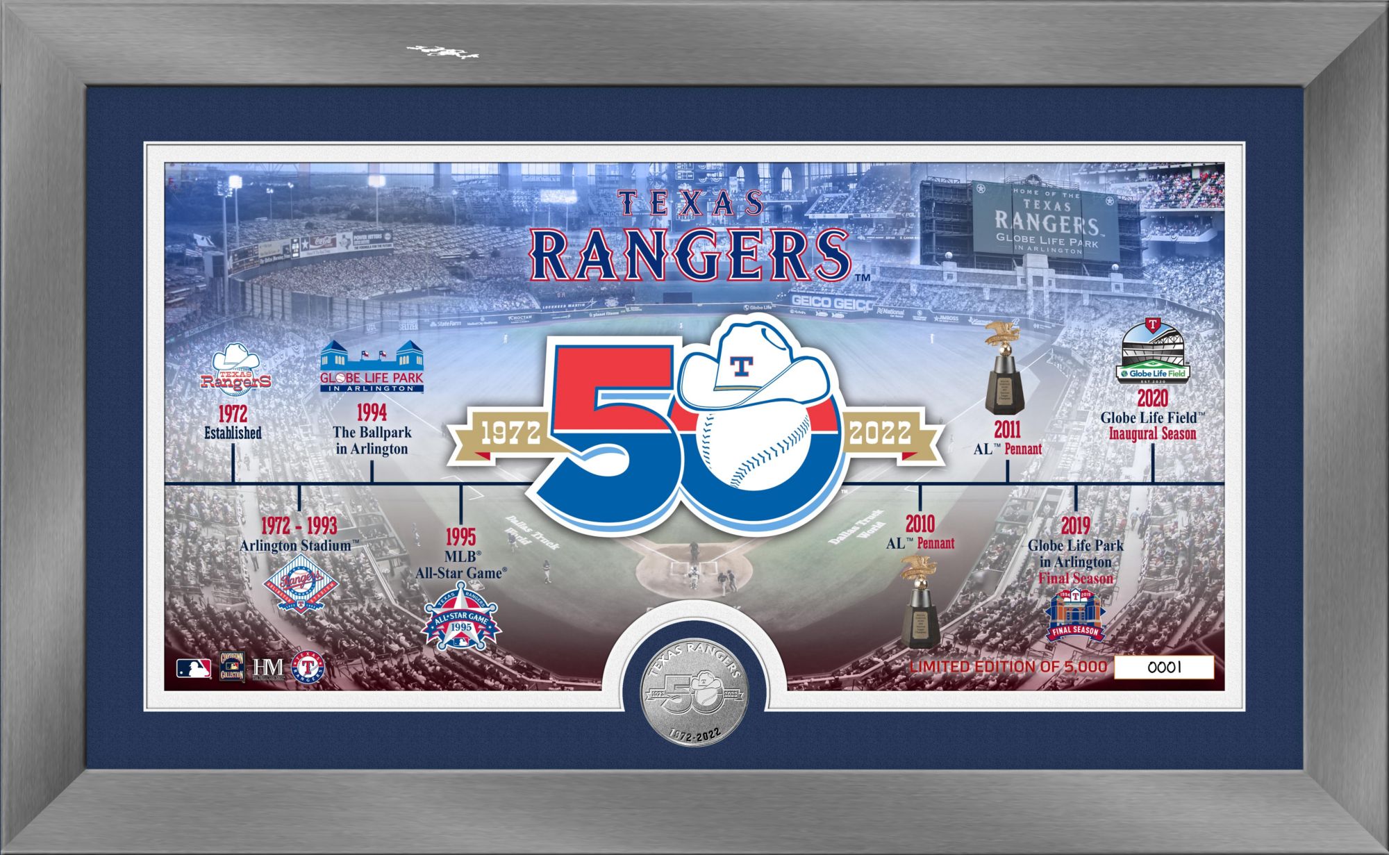 12" x 20" frame features matted under plexiglass a timeline listing the Rangers outstanding achievements since their inaugural season in 1972 through the present with the official Texas Rangers 50th Anniversary logo superimposed in the center