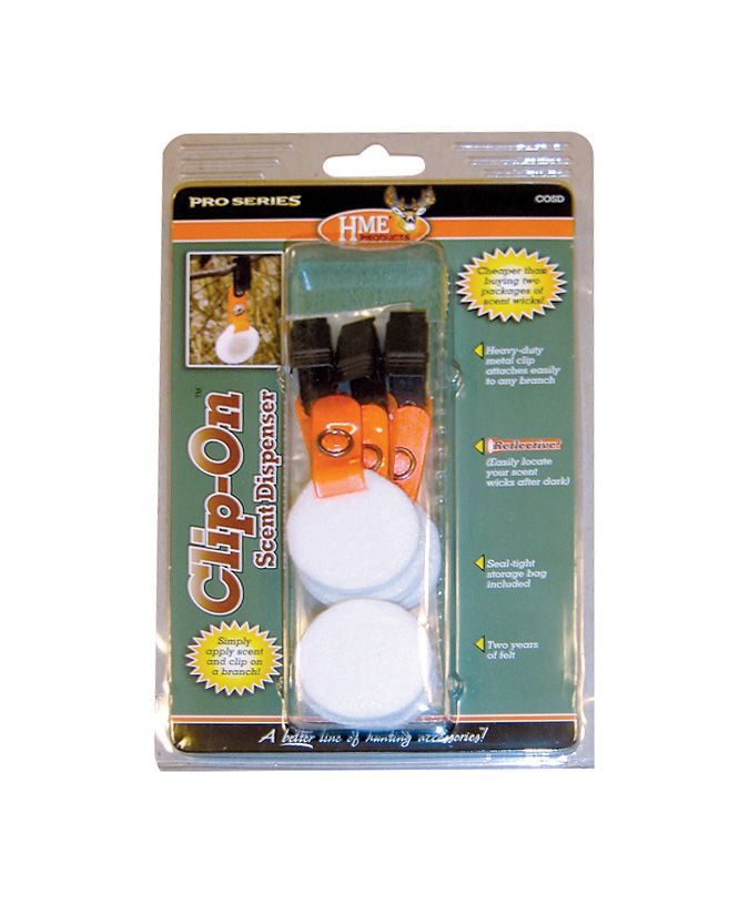 The HME® Clip-on Dispenser is incredibly easy to use and a great attractant for deer. These clips hold and scent pad and clips to any small branch. Hang these from trees and see how many deer you bag!