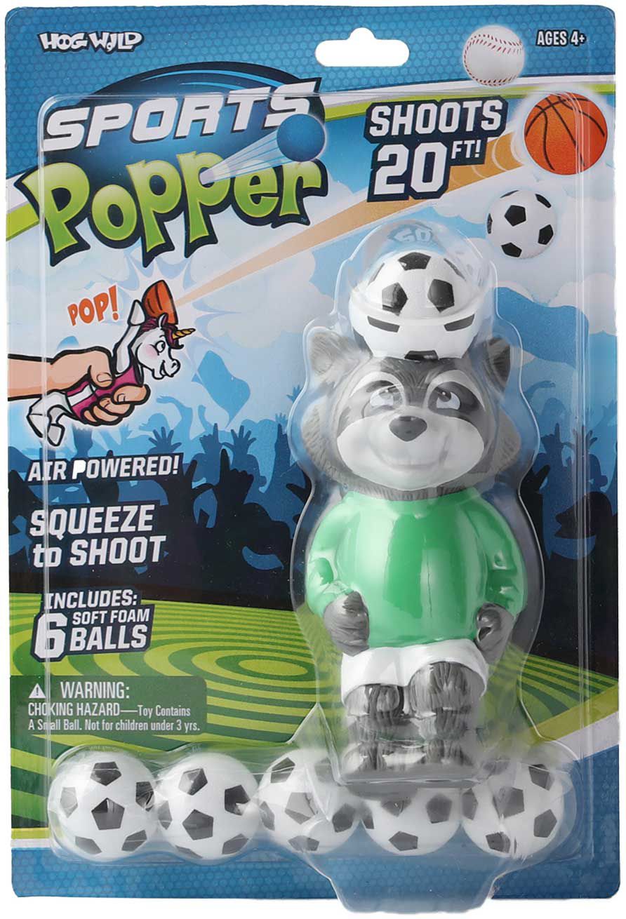 With miniature soccer balls and major fun, the Hog Wild Raccoon Soccer Popper will provide kids entertainment for hours. Easy to use, you simply load the foam soccer ball into the opening and squeeze the popper to shoot the ball up to 20 feet! This popper toy is the shape of a raccoon, and includes six soft foam soccer balls.