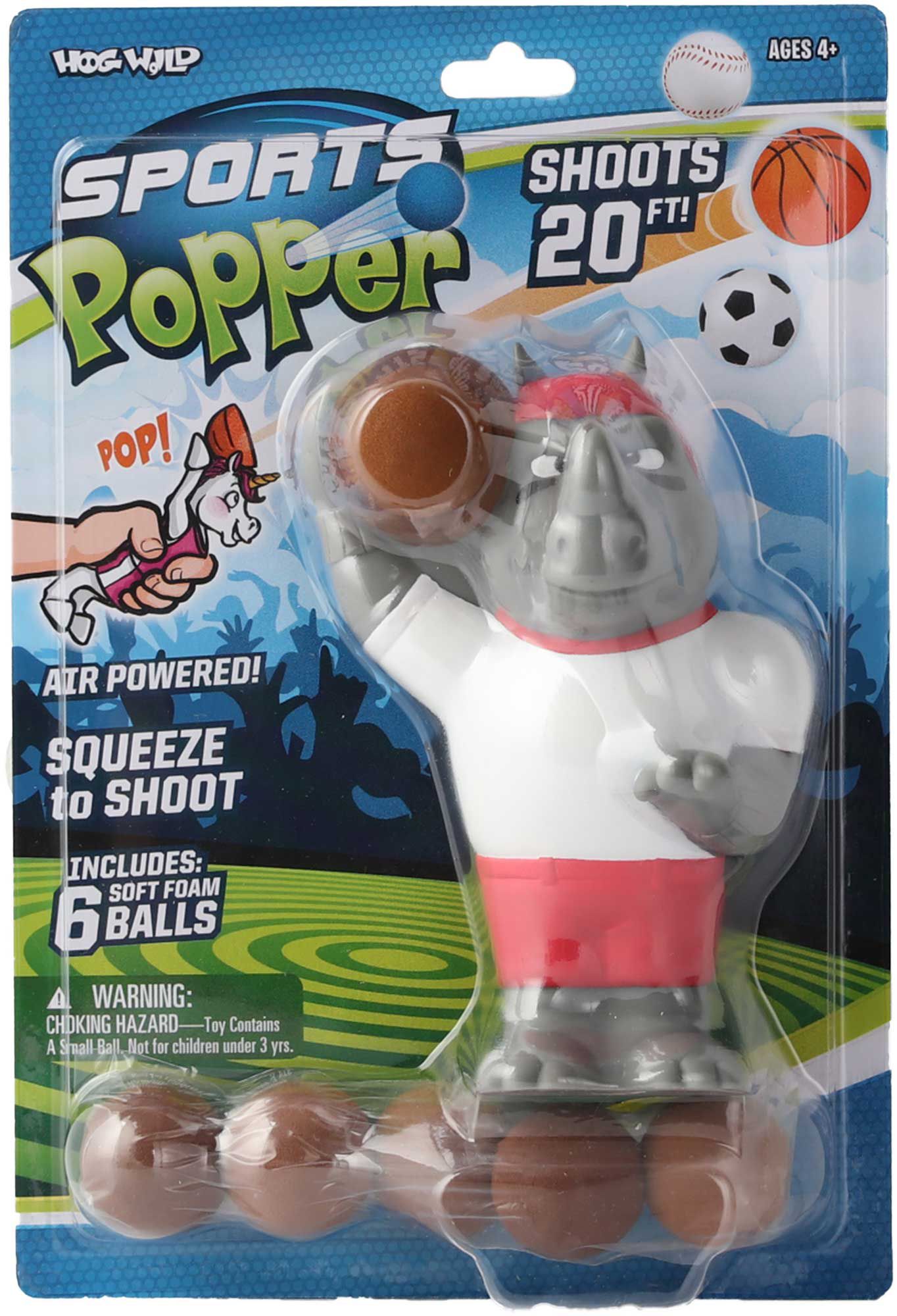 With miniature footballs and major fun, the Hog Wild Rhino Football Popper will provide kids entertainment for hours. Easy to use, you simply load the foam football into the opening and squeeze the popper to shoot the ball up to 20 feet! This popper toy is the shape of a rhino, and includes six soft foam footballs.