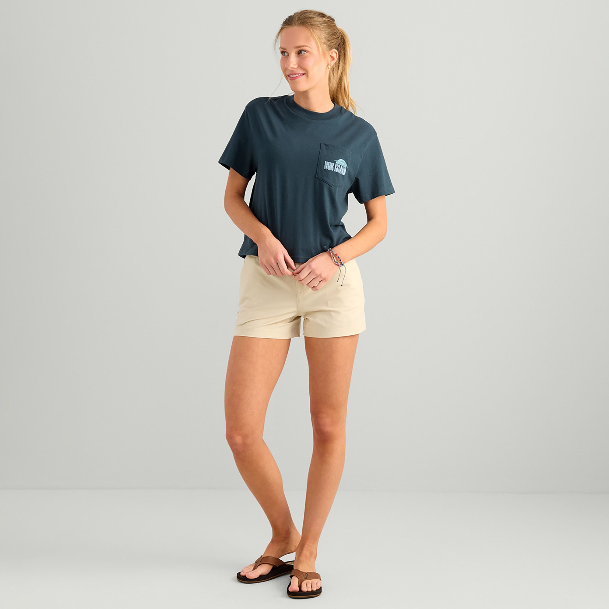 This soft, easy-wearing pocket t-shirt is made from a cotton-poly blend and designed with a cropped 21” length for casual comfort and easy everyday style.