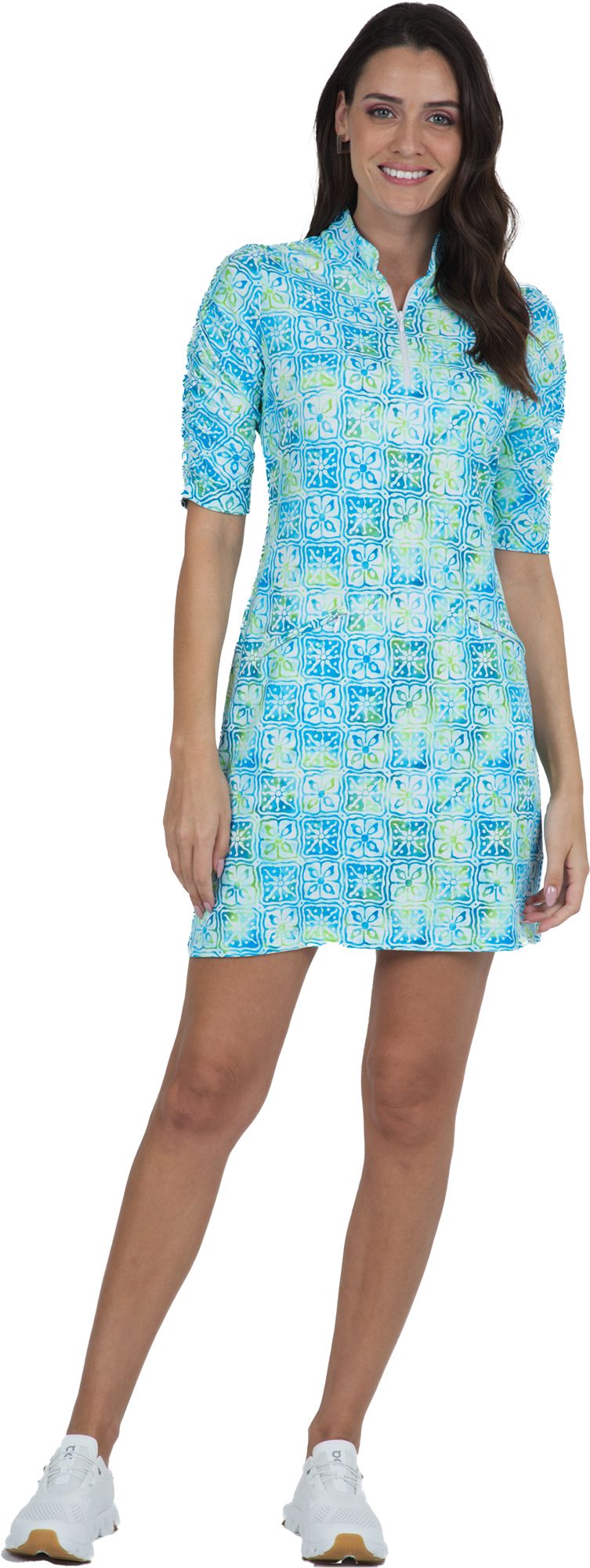Sophisticated shaping featuring a mandarin collar and feminine shirring down the elbow-length sleeves make this dress especially flattering as well a practical with two front-zip welt pockets. Made in our patented IceFil fabric, which lowers your skin temperature by up to five degrees using your perspiration as a catalyst plus the added elements of UPF 50+ protects you from sun's harmful UVA/UVB rays, moisture-wicking, anti-microbial properties keep you dry and odor-free throughout the day.