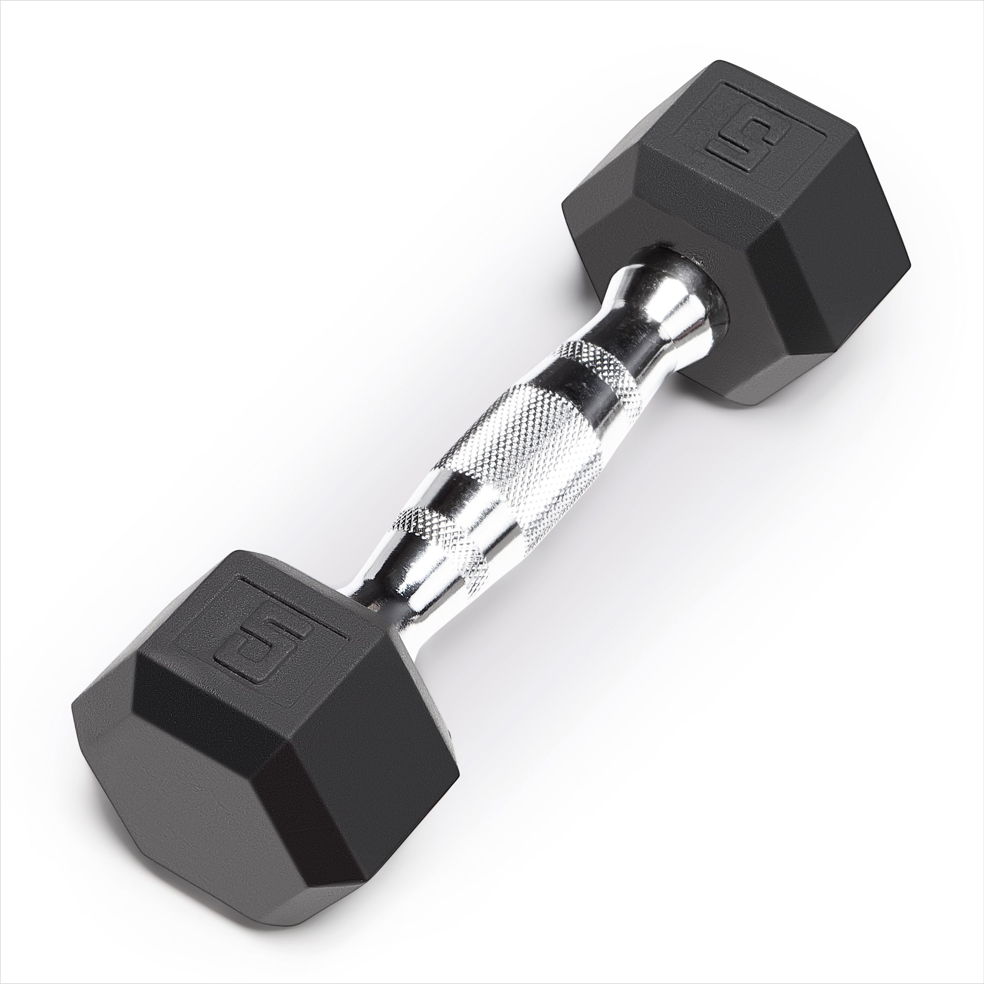 Rubber covered Hex-shapedHighly durableSix-sided shape keeps dumbbells in placeSolid cast iron core and durable rubber coatingNon-rust chrome with long lasting finishContoured ergonomic knurled grip to prevent slipping