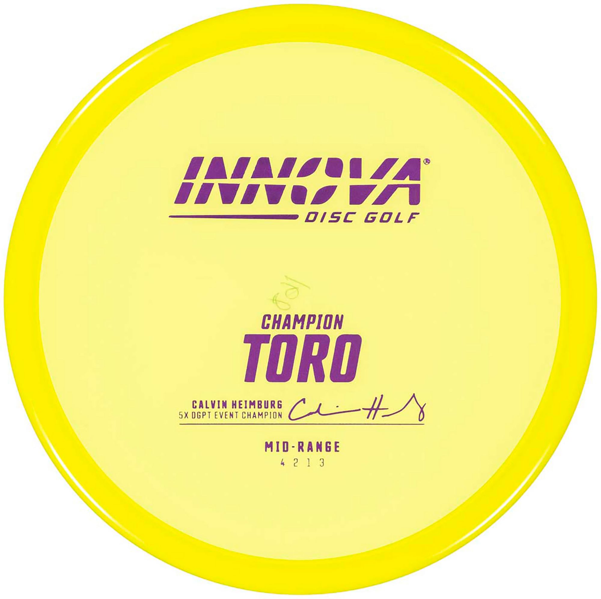 Calvin Heimburg was the inspiration behind the Toro. He wanted a flat-top, overstable, mid-range disc that he could have confidence in—something that could handle his level of forehand torque. After several variations, the Toro was created and named by Calvin. —Dave Dunipace