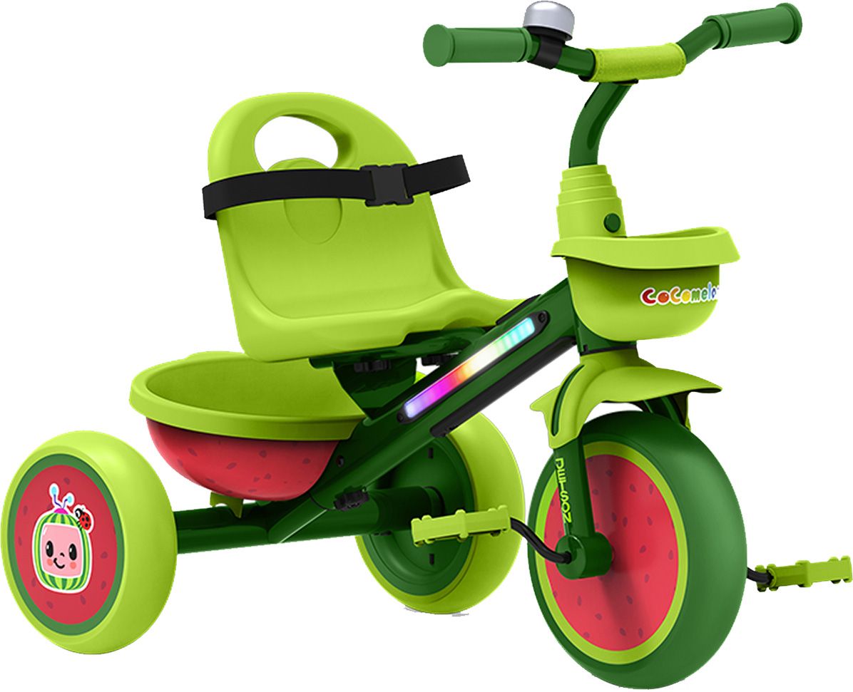 Preschool-aged fans of CoComelon will be pedaling their way into playtime on this CoComelon-themed light-up tricycle. Bright and shiny in the show’s signature watermelon colors, with its iconic logo on each wheel, this is a ride they’ll be proud to show off to JJ, TomTom, YoYo, and all their friends. They’ll have fun ringing the bell and activating the integrated LED lights—which are bright, fun, and interactive, with a button they can push to change the illumination colors and patterns. (8 total options) 2 baskets are perfect for carrying everything from crayons to cookies. 4 sheets of CoComelon stickers included. Easy assembly. Recommended for riders ages 2 to 4.