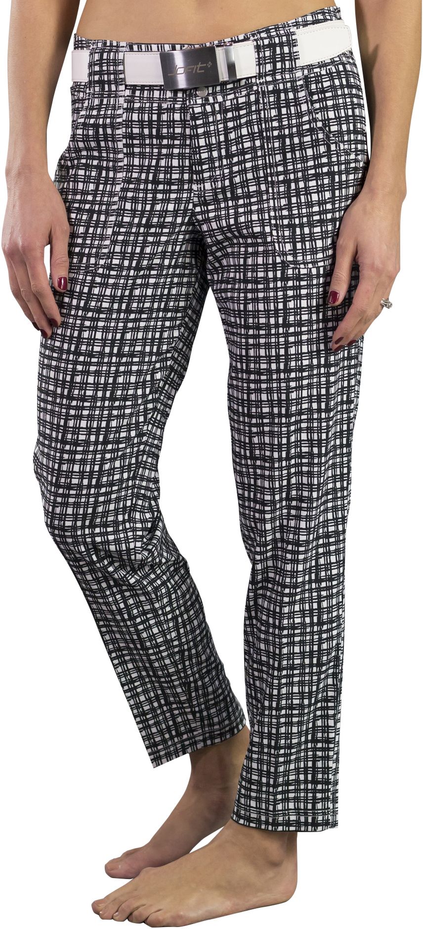 Spruce up your on-course look with the Jofit Women's Belted Cropped Printed Golf Pants. Crafted with fabric that is engineered for stretch and recovery, these pants offer you increased mobility while you play. The modern fit sits comfortably on your hips with a wide contoured waistband, and the four pockets offer you plenty of storage space.