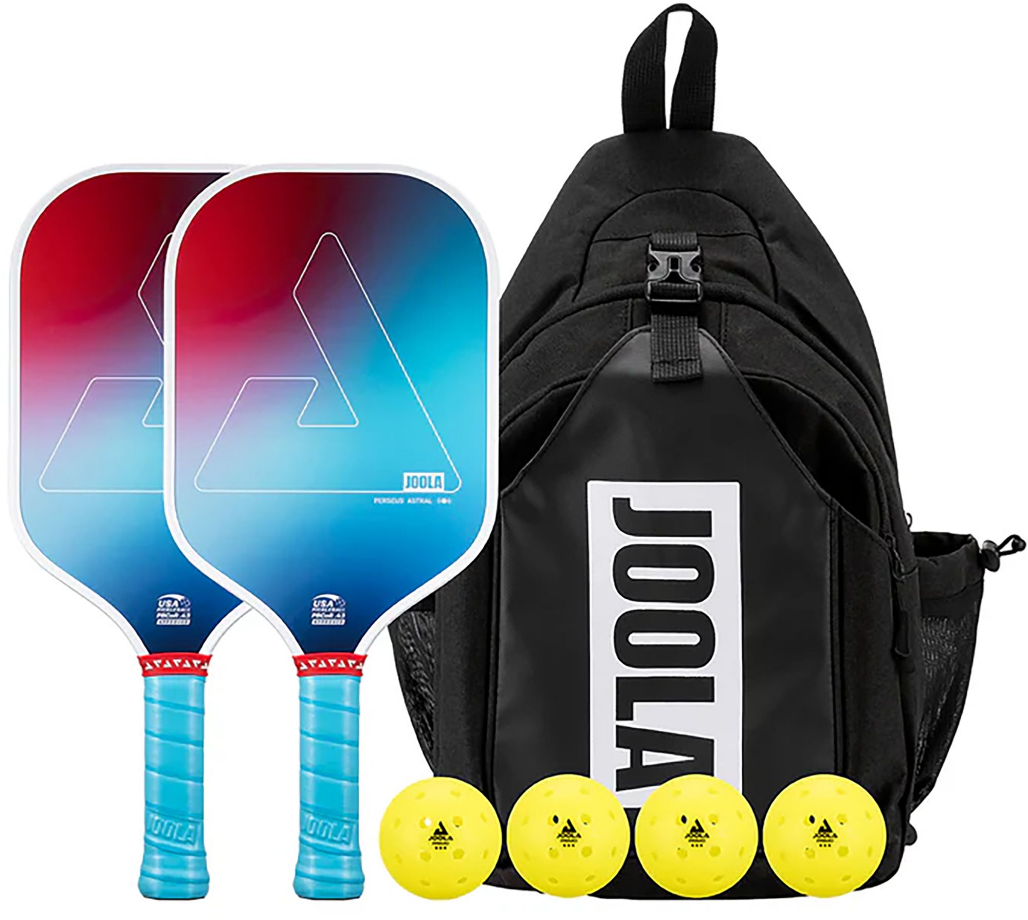 The JOOLA Perseus Astral Paddle Set is the perfect starter bundle for anyone stepping into pickleball for the first time. Complete with (2) Perseus Astral paddles, (4) JOOLA Primo pickleballs, and (1) stylish over-the-shoulder sling bag, this set gives new players everything they need to show up ready to play. Each paddle features JOOLA’s iconic Perseus shape for dependable balance and a responsive feel. Thoughtfully assembled and beginner-friendly, this bundle makes it easy to learn the game, practice with a partner, and carry your gear in style.
