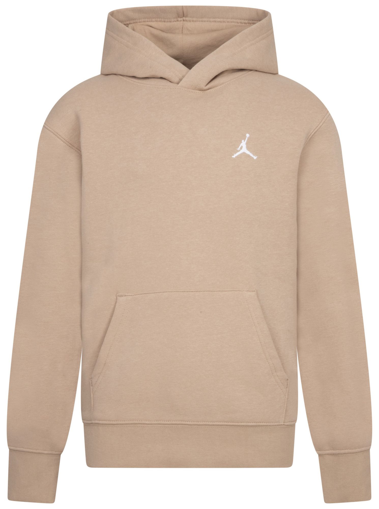 Crafted for young athletes, the Jordan Kids' Brooklyn Fleece Pullover combines cozy fleece fabric with a stylish hood and convenient kangaroo pocket. Featuring long sleeves, ribbed cuffs, and a Jumpman logo at the left chest, this pullover is perfect for casual wear and active days alike. Effortlessly maintain its fresh look with easy machine wash care, making it a practical and fashionable addition to any youth wardrobe.