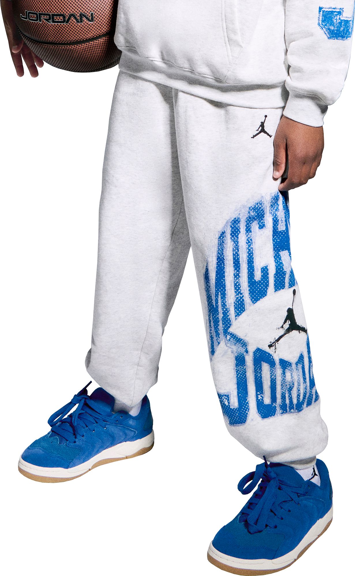 Dress like an MVP in these pants from Jordan, which feature distressed text graphics on the outer left leg. They're made of cotton/poly fleece knit fabric in a classic jogger silhouette with a stretch waistband with drawcord for a comfy fit and tapered legs for a cozy, secure feel. Style with the Jordan Jumpman MVP Fleece Pullover Hoodie for a coordinated look that complements your kicks.