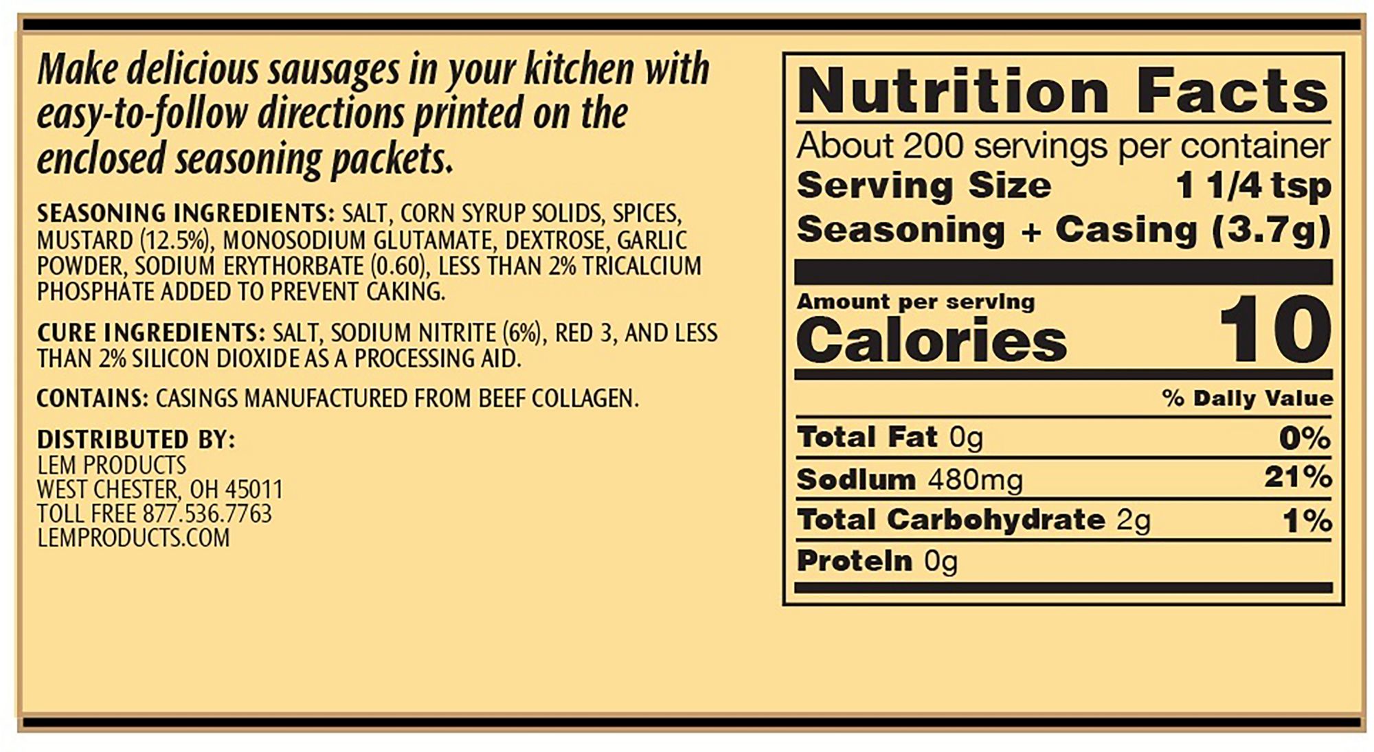 • Kit includes seasoning for 20 lbs. of meat, 21mm collagen casings, and directions