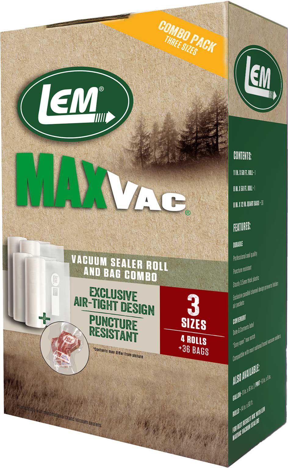 Achieve professional vacuum-sealing power at home with the LEM MaxVac Gallon Vacuum Bags and Rolls Combo Pack. This pack includes 36 quart-sized vacuum bags, as well as an 8-inch by 25-foot roll and an 11-inch by 25-foot roll. They features a unique parallel-channel design to prevent air pockets, making them suitable for any cooking or hunting storage need.