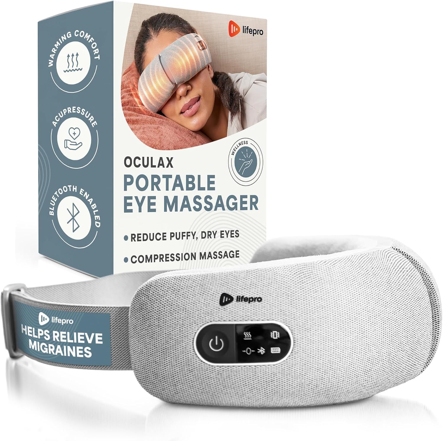 Relieve eye fatigue and headaches with Lifepro's eye massager. Enjoy rhythmic percussion massage, oscillating pressure, and soothing heat targeting pressure points. Customize your experience with 4 programs and 2 modes. Play your favorite music via Bluetooth. Small, portable, and foldable for on-the-go relief. With a lifetime warranty and support from our 'guiding angels,' experience soothing comfort anytime, anywhere!