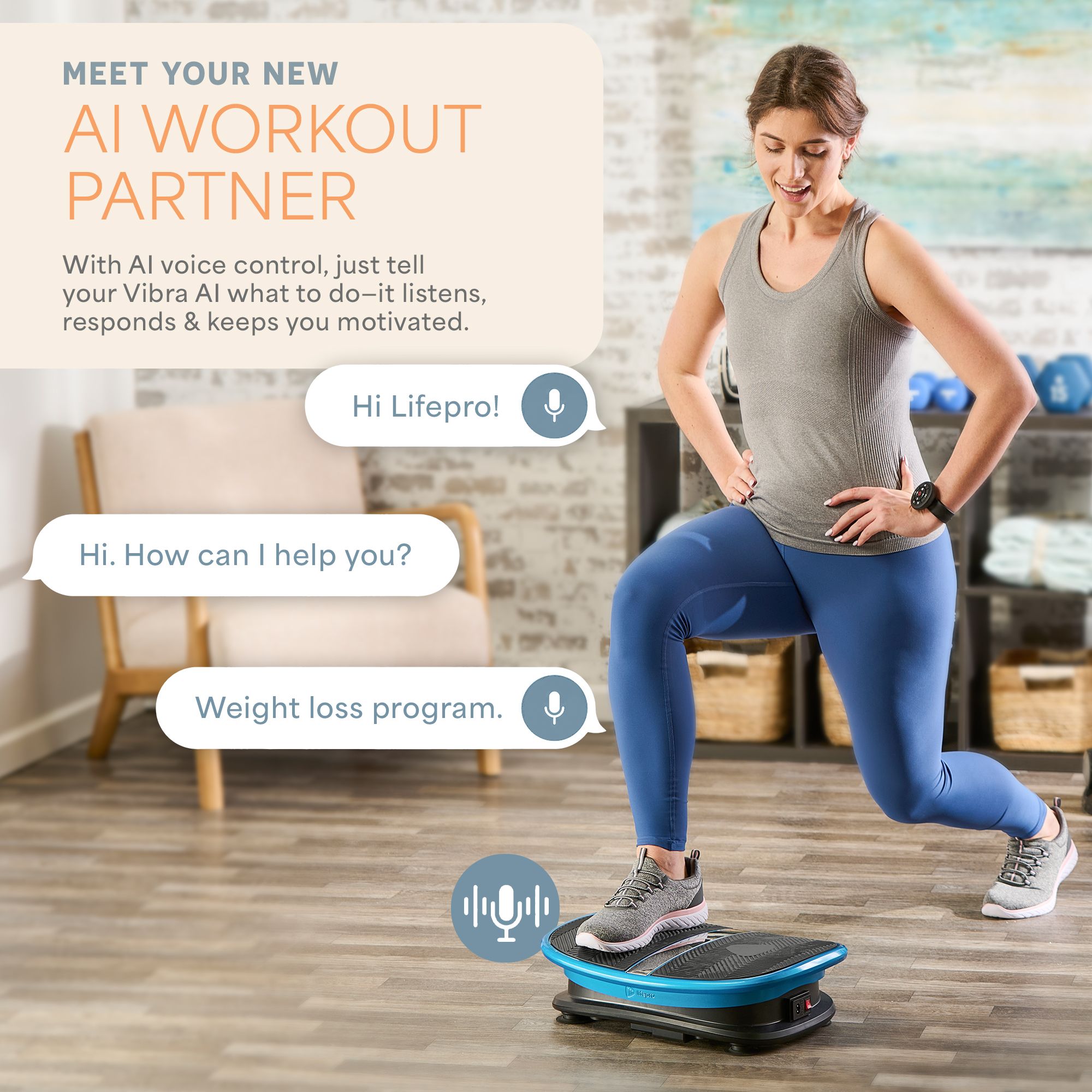 Elevate your fitness routine with the Lifepro VibraAI Thermo Heated Vibration Plate. This state-of-the-art equipment features vertical vibration powered by artificial intelligence for precision control through voice commands. The heated platform offers therapeutic benefits to soothe and relax muscles, enhancing recovery. Its curved design matches the natural contours of your feet for comfortable use during extended workouts. Navigate your workout options easily with a modern touch screen and manage settings remotely with a sleek watch. Perfect for any fitness level, the VibraAI is designed to bring high-quality, efficient exercise into your home.