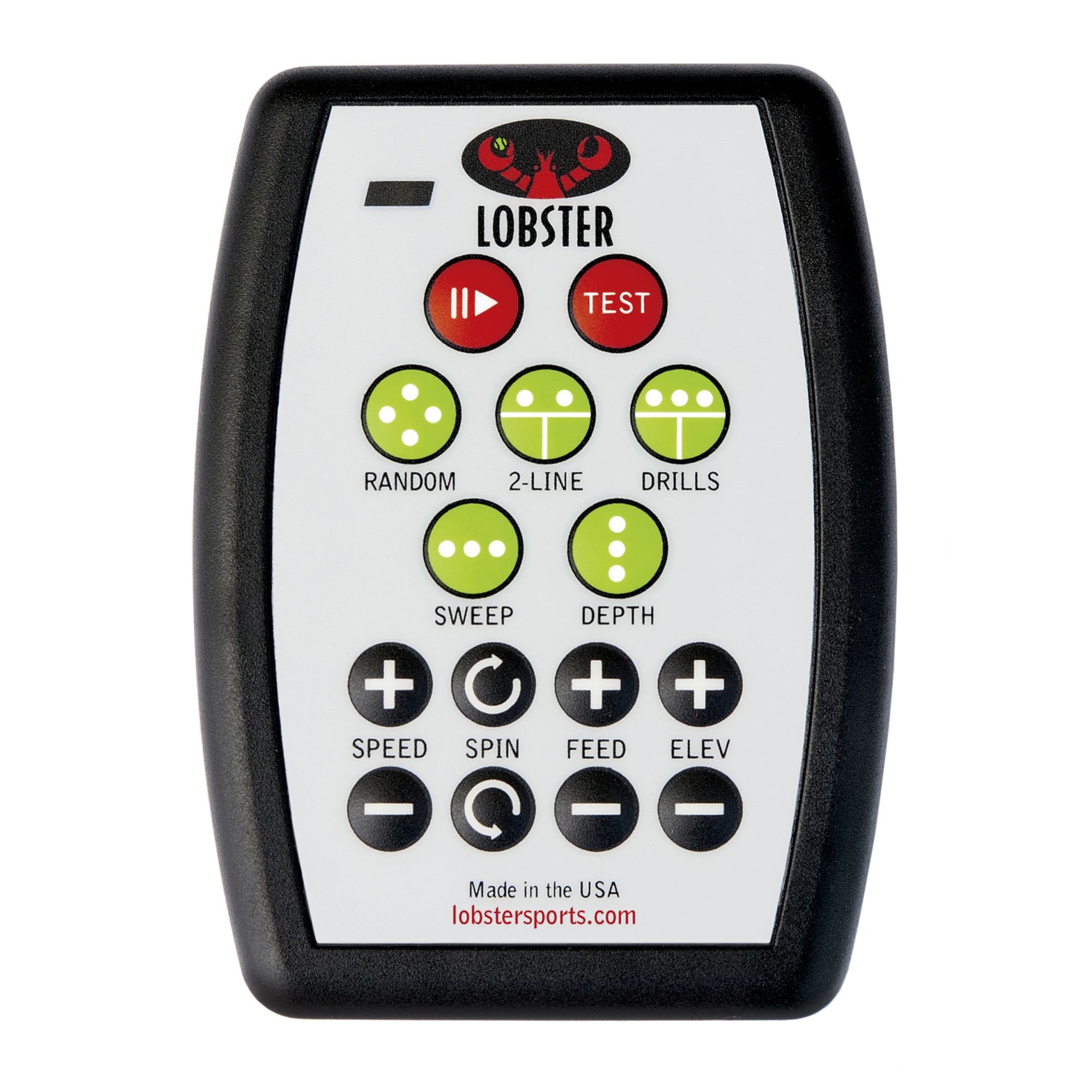 The state-of-the-art compact controller allows you to make instantaneous changes to your Lobster tennis ball machine like: play/pause, oscillation sweep, fully random, 2-line, speed, feed, spin, and much more.
