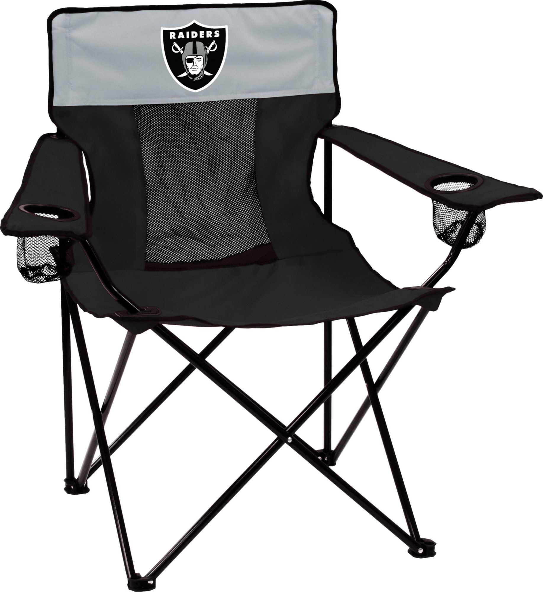 Settle in and keep your beverages close at hand while supporting your favorite team with the Logo® Las Vegas Raiders Elite Chair.