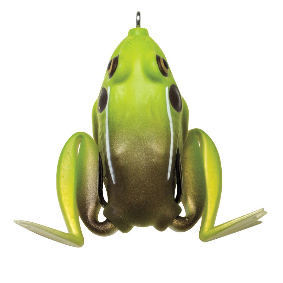 Hyper-realistic features make the Lunkerhunt Lunker Frog king of all frog baits. The legs extend on retrieve and retract on the pause, perfectly mimicking the swimming action of the real thing. It even sinks slightly when still. The soft, hollow body and weedless design make the Lunkerhunt™ Frog the ideal bait for pulling lunkers out of cover.