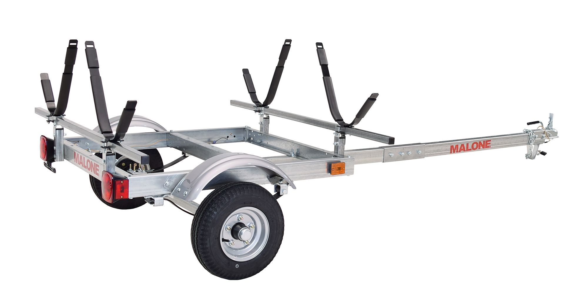Constructed with high grade galvanized steel, the Malone® EcoLight 2 Kayak Trailer Kit with J-Racks offers the durability you need in a trailer. With the ability to easily travel at most posted speed limits, you’ll be able to haul your precious cargo to and from your adventure location in no time at all. This two kayak trailer features two J-style kayak carrier racks with all mounting hardware for easy and efficient transport to and from the water this season.