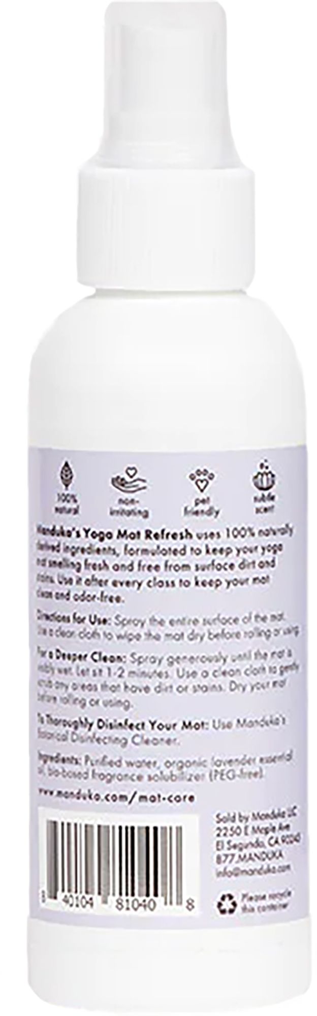 Manduka's Yoga Mat Wash & Refresh uses 100% naturally derived ingredients, formulated to keep your yoga mat smelling fresh and free from surface dirt and stains. Use it after every class to keep your mat clean and odor-free.