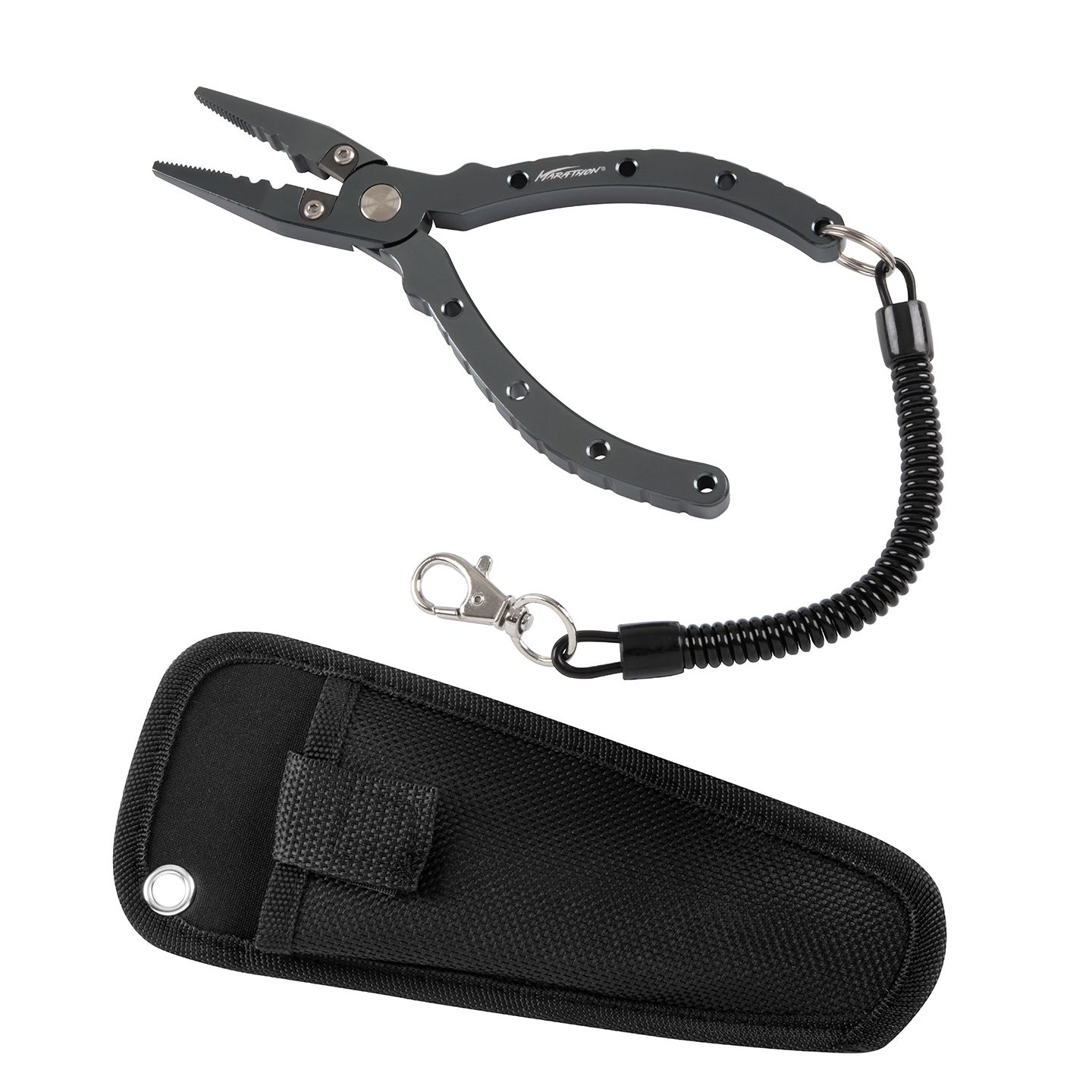 The Marathon® Ultra-strong Aluminum Pliers are made from aircraft grade anodized aluminum and feature replaceable tungsten-carbide cutters. The ergonomig grip handles ensure a firm comfortable hold. It also includes a heavy-duty nylon sheath and coiled teather. The Marathon Ultra-strong Aluminum Pliers are ready for your next fishing adventure.