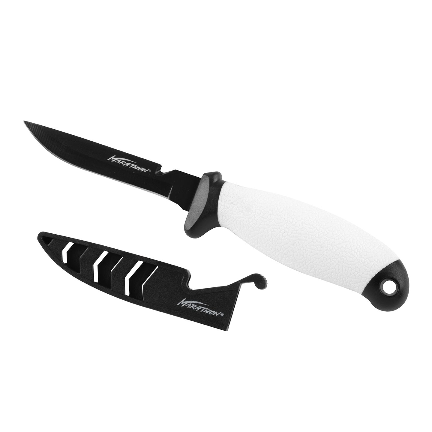 The Marathon® 4" Teflon Coated Bait Knife features a 4" 4116 Greman Stainless Steel blade with a black Teflon coating that prevents rust and corosion and keeps meat from sticking to the blade. The durable, non-slip ergonomic rubber gip will always ensure a secure cut. It includes a protective saftey sheath that allows for safe and easy storage. The Marathon 4" Teflon Coated Bait Knife is ready for your next fishing adventure.
