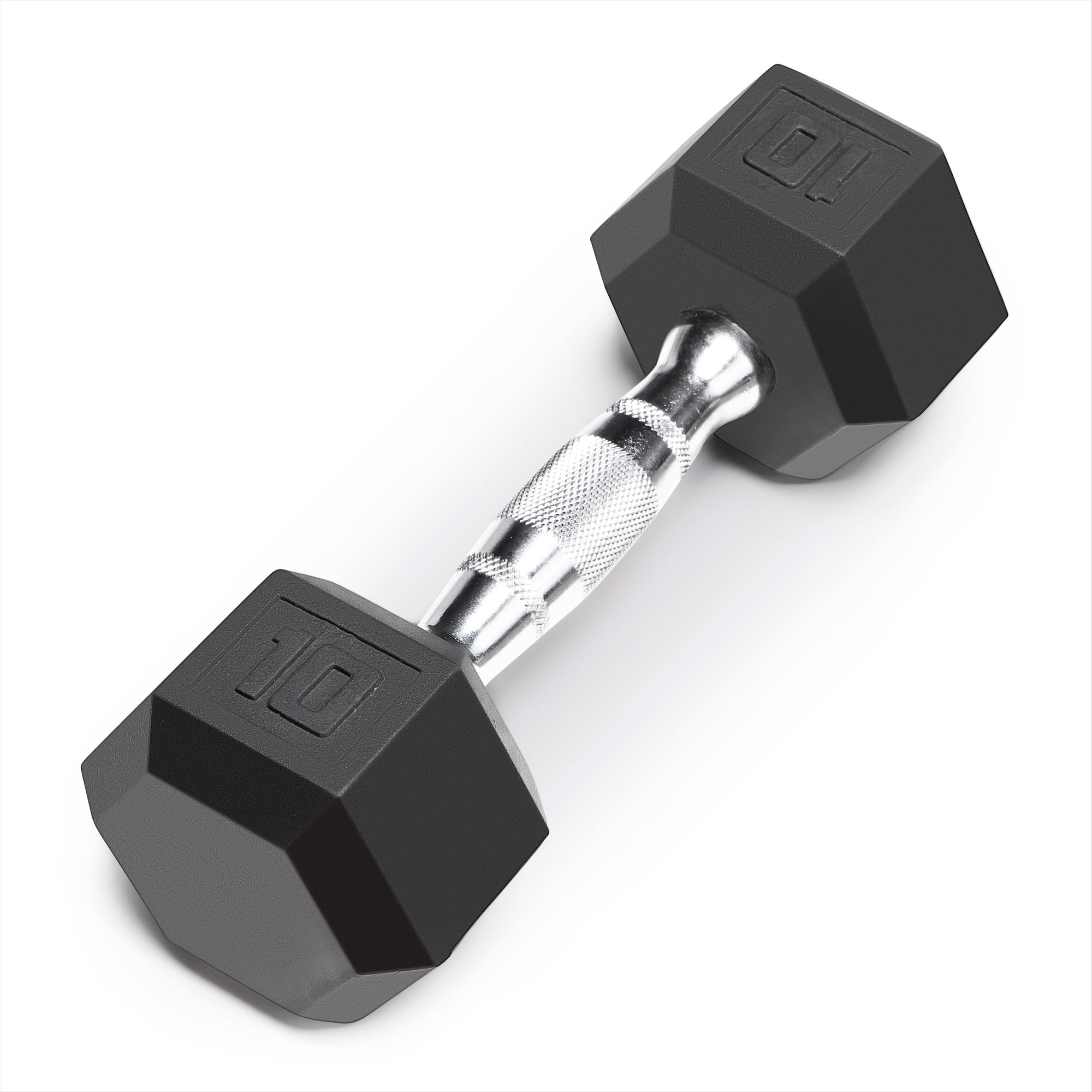 Rubber covered Hex-shapedHighly durableSix-sided shape keeps dumbbells in placeSolid cast iron core and durable rubber coatingNon-rust chrome with long lasting finishContoured ergonomic knurled grip to prevent slipping