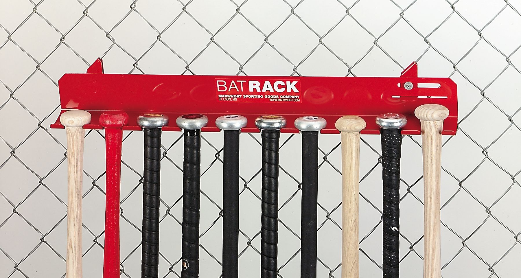 Conveniently store all of your practice and game day bats along the fence and keep the dugout tidy by using the Markwort® Aluminum Bat Rack. This durable aluminum rack can hold up to ten bats, and interlocks with chain link fences for quick and easy installation.